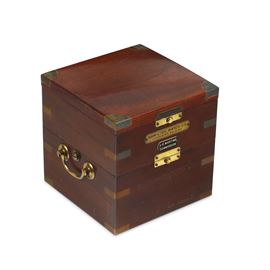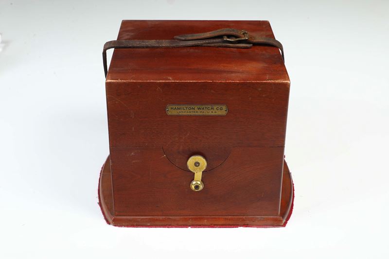 In custodia originale in legno con dettagli in ottone; movimento da 48 ore, quadrante argentato (firmato "Hamilton Lancaster U.S.A.")