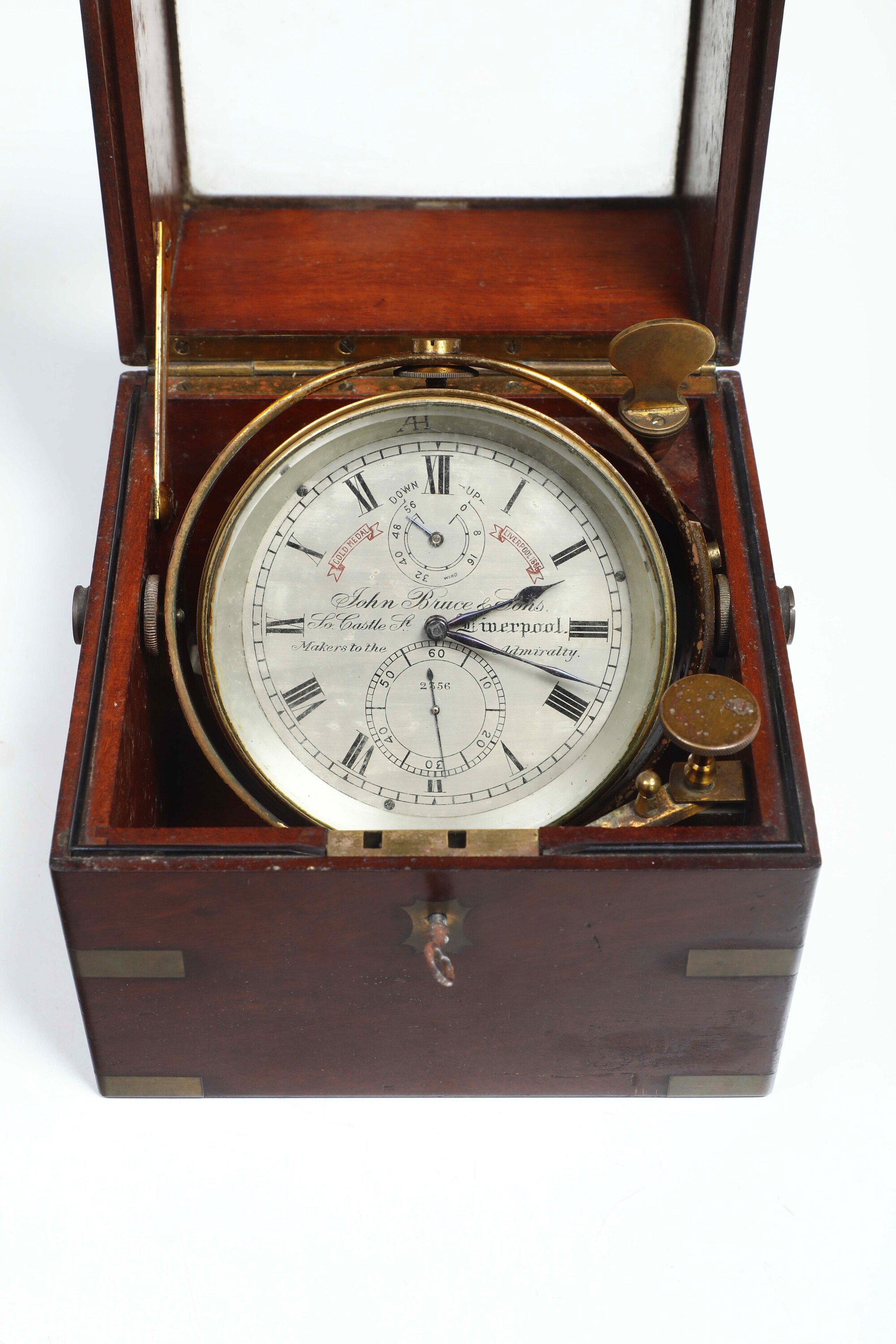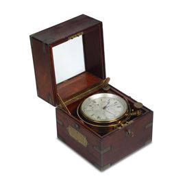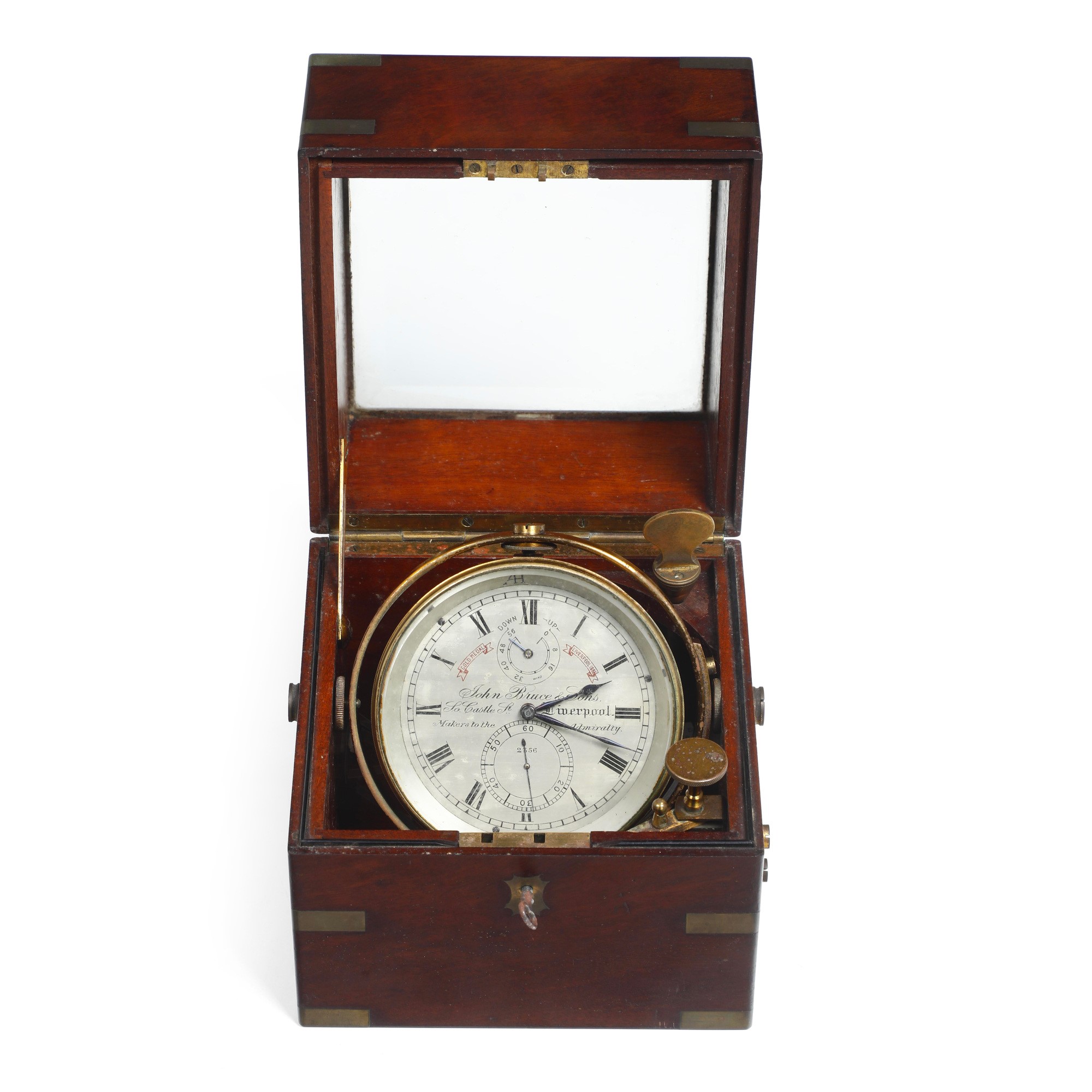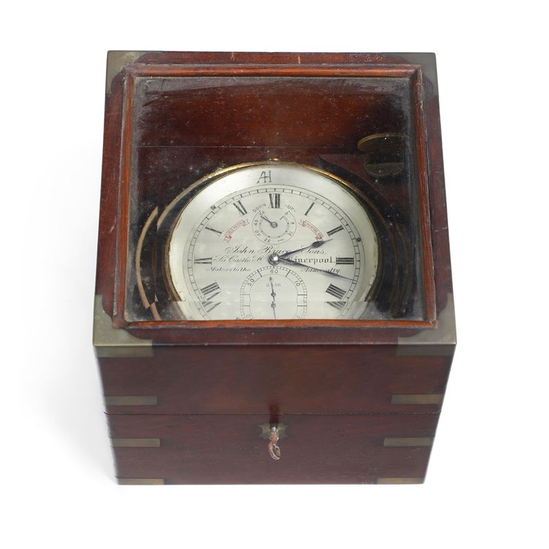 cronometro da marina con 2 giorni di carica, nella sua scatola originale in mogano con dettagli di ottone, movimento da 56 ore. Quadrante firmato John Bruce & Sons, 27 Wapping, Liverpool
