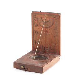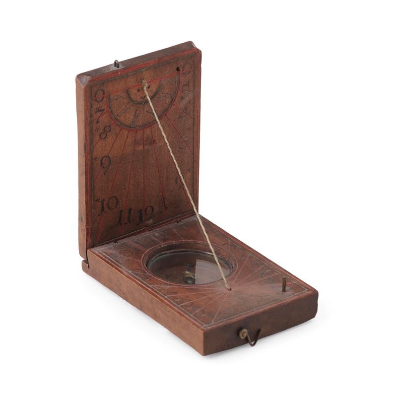 Orologio solare dittico da viaggio in legno e carta dipinta. Firmato P.B, Germania XVIII-XIX secolo