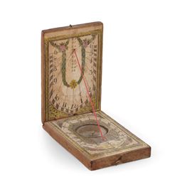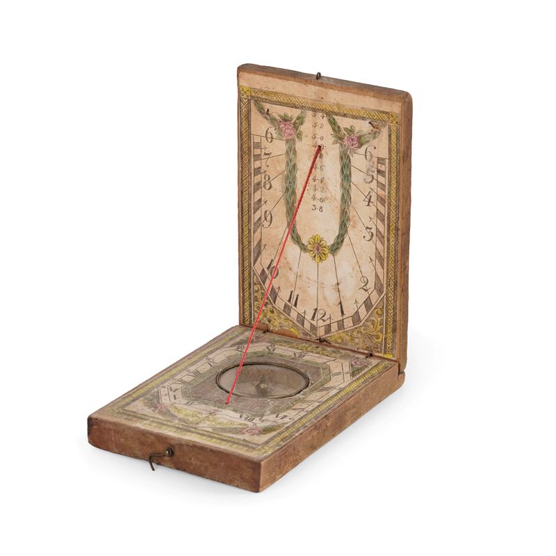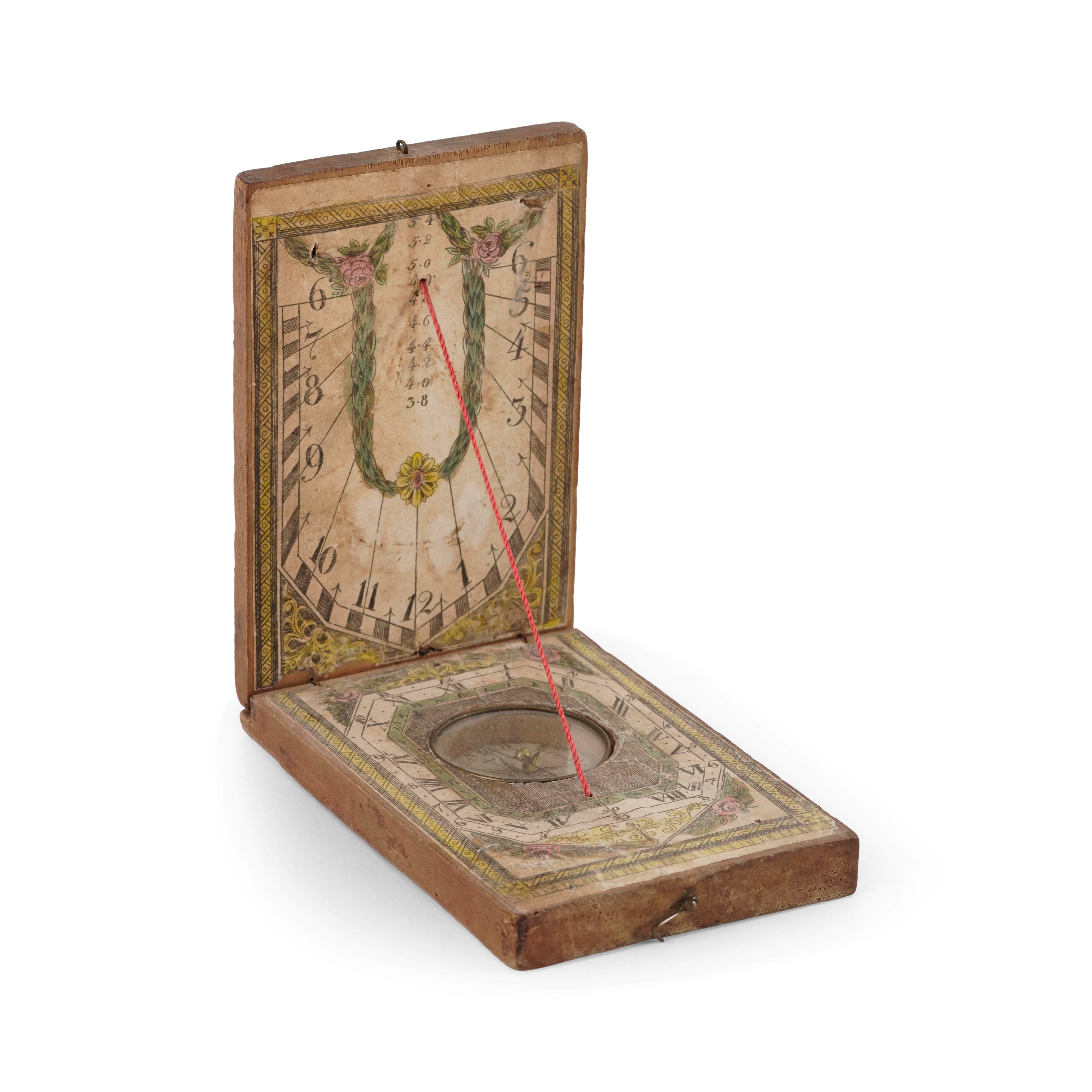 Orologio solare dittico da viaggio in legno e carta dipinta. Firmato P.B, Germania XVIII-XIX secolo