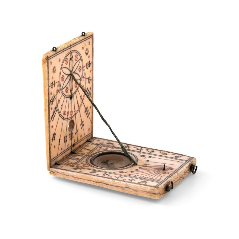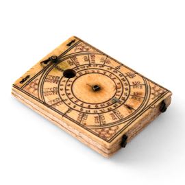 in avorio inciso in rosso e nero completo di bussola mancante sul dorso della volvella per la conversione delle ore lunari in quelle solari.