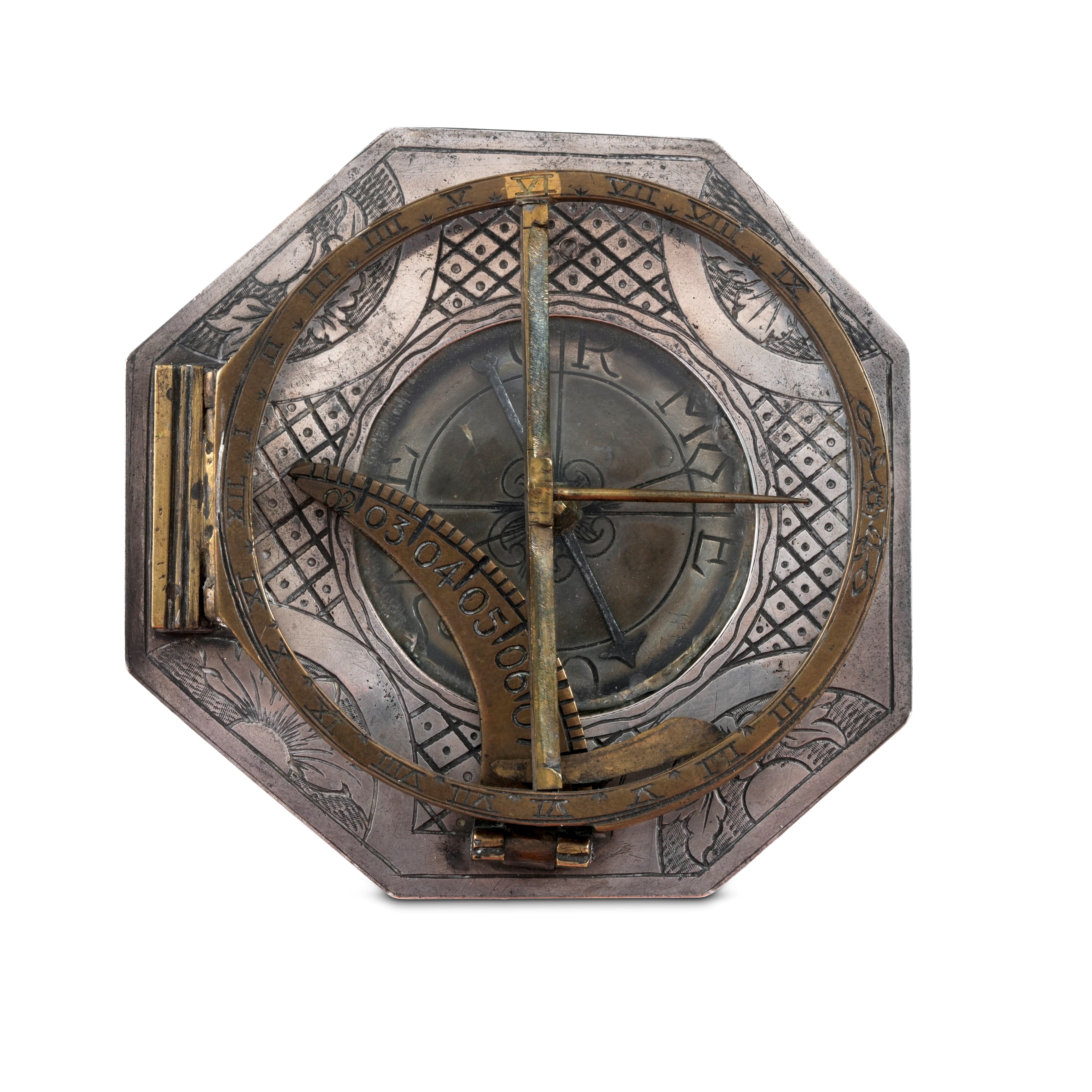Orologio solare ottagonale equinoziale in argento e ottone. Firmato Andreas Vogler, bollo della città di Ausburg, XVIII [..]