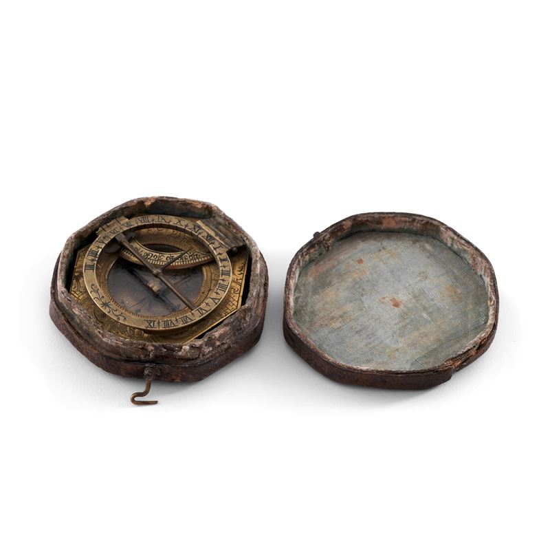 sul retro incise le latitudini di varie città; completo di astuccio in pelle e di bussola.