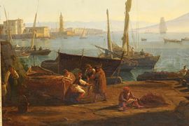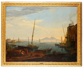 Scuola della fine del XVIII secolo Veduta di porto con Vesuvio