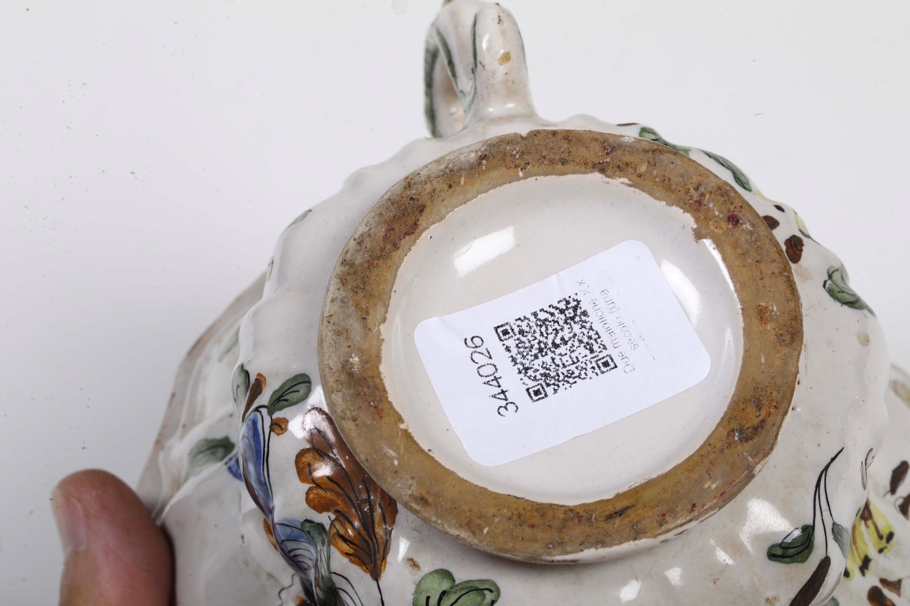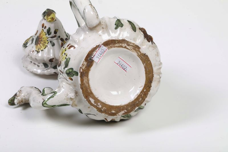 Maiolica. Marca: assente. Altezza massima cm 23,5. Conservazione: piccole sbeccature e cadute di smalto ai bordi.