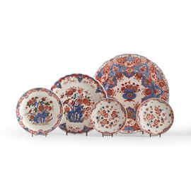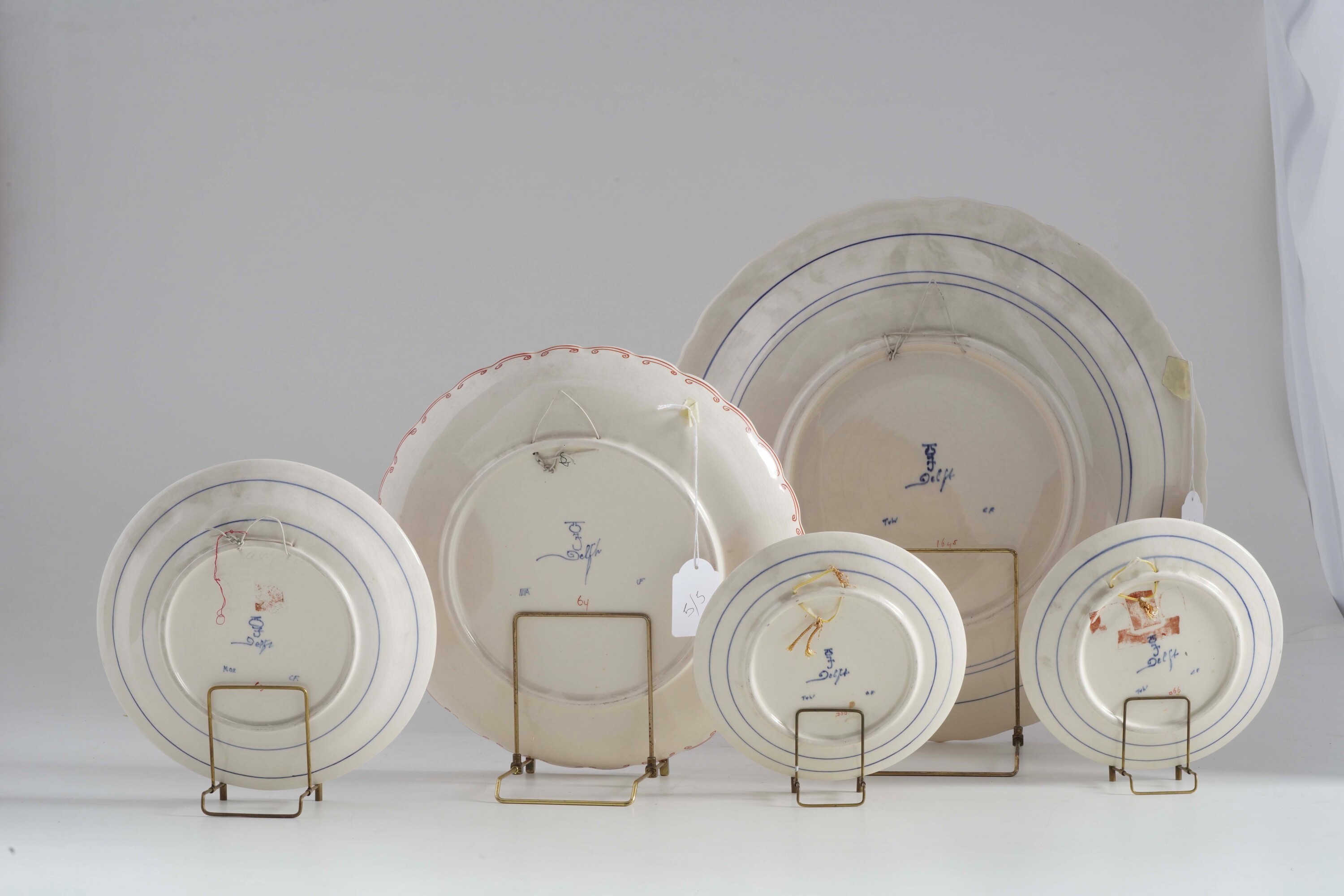Maiolica dipinta in policromia e oro alla maniera olandese dei primi del ‘700. Marca: simbolo grafico e “Delft”. Diametro cm 41; cm 31; cm 23; cm 18,6. Conservazione: ottima