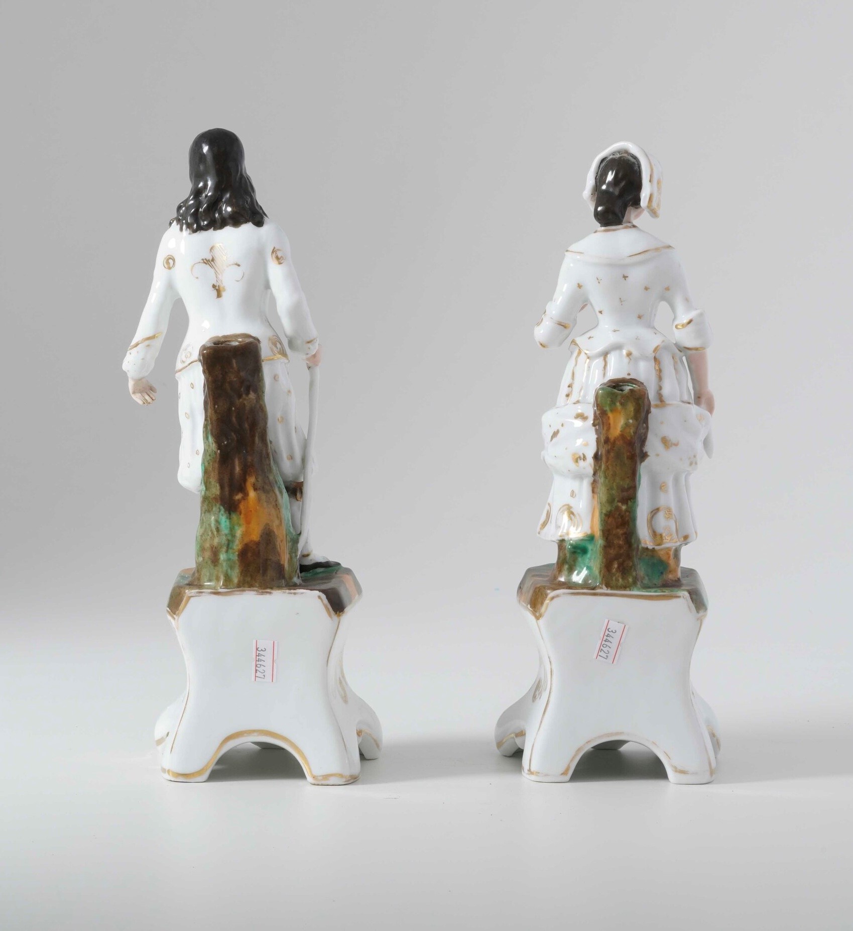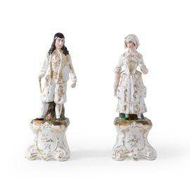 Porcellana. Marca: assente. Altezza cm 33. Conservazione: mano di lui rotta e incollata; mancanza all'estremità del bastone; estese usure all'oro