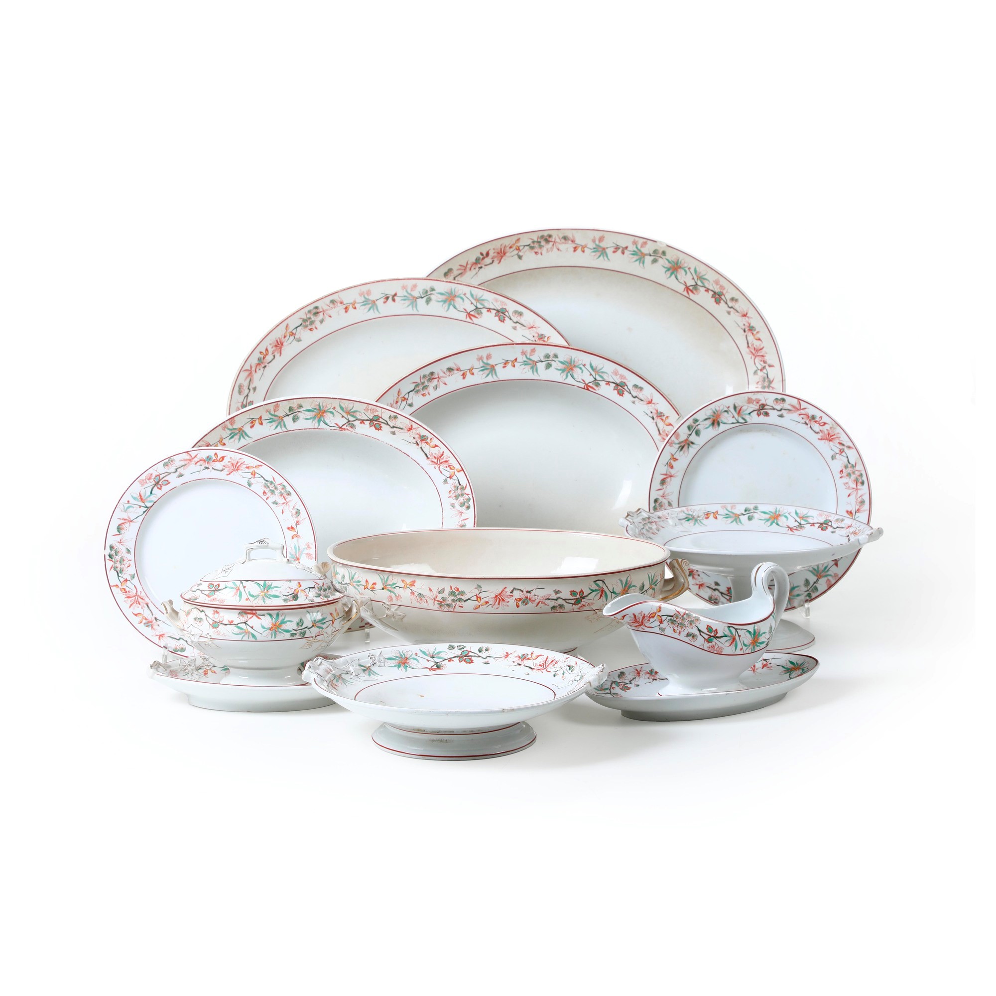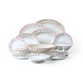 Il lotto conta 25 pezzi ed è così composto: 1 piatto fondo; 12 piatti da dessert; 1 zuppiera senza coperchio; 2 salsiere; 4 alzatine; 5 piatti da portata ovali.