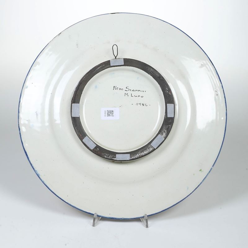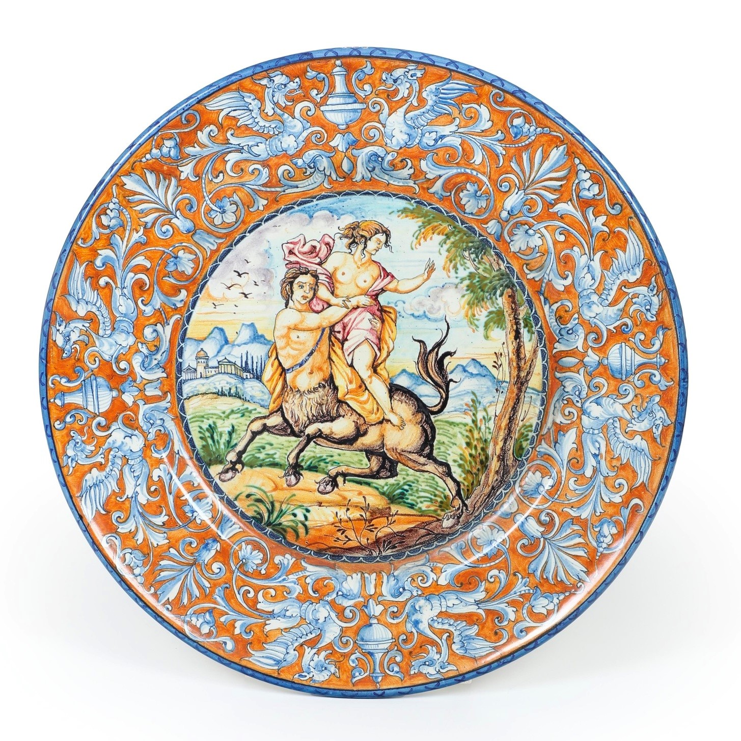 Piatto in maiolica istoriata con scena del mito di Deianira e Nesso. Firma sul verso "Nedo Scappini 1986". Diametro cm 44. Conservazione: ottima