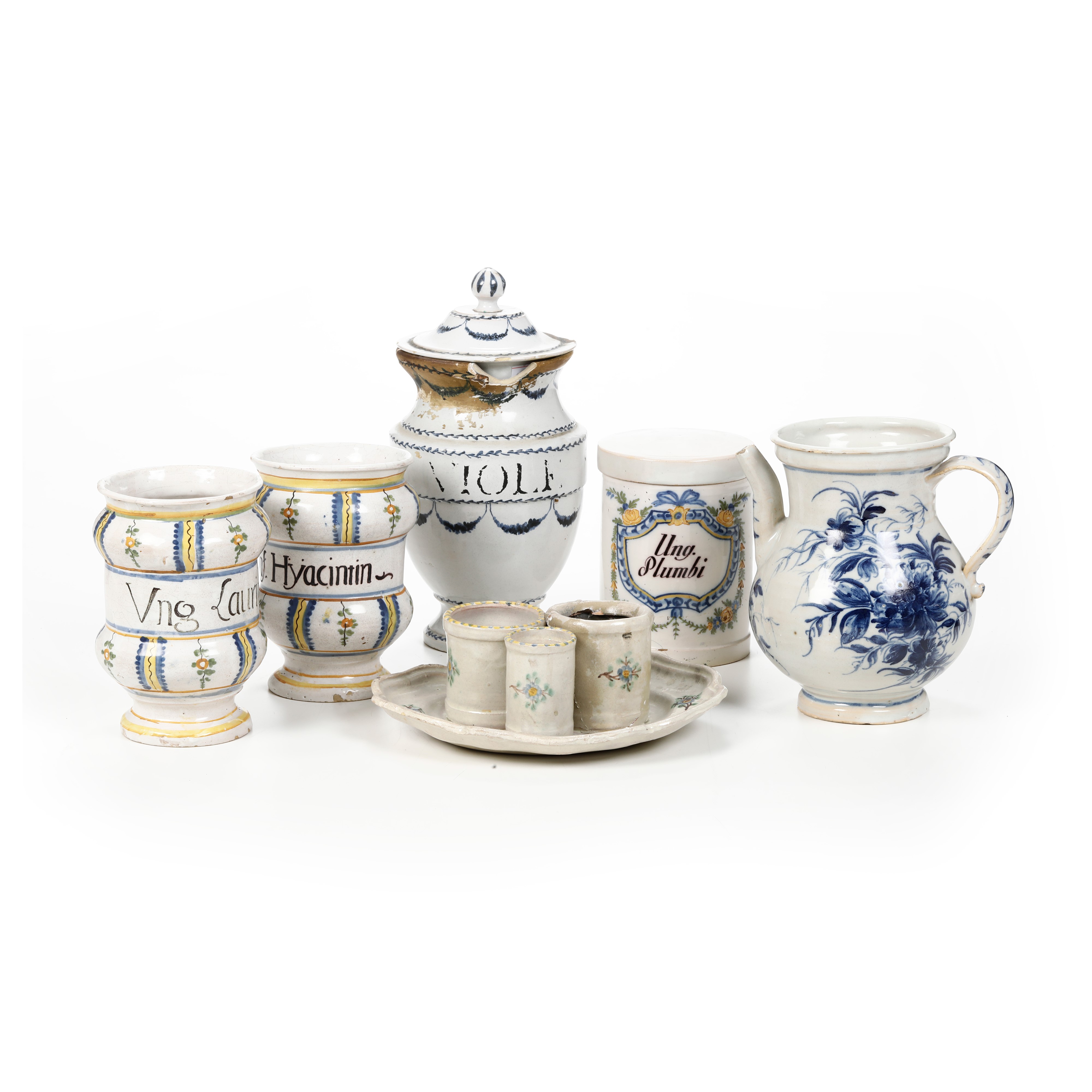Maiolica. Altezza massima cm 29. Conservazione: ottima, esclusi il vaso con coperchio e l’oliera che presentano ampi restauri.