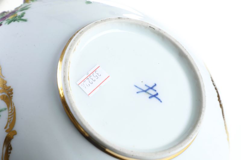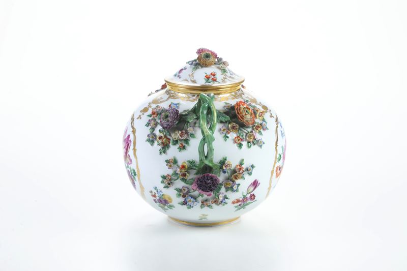 Porcellana policroma e dorata. Marca: spade incrociate, falsa marca di Meissen. Altezza cm 25,5. Conservaziuone: ottima; alcune insignificanti mancanze ai petali dei fiori