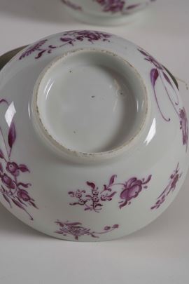 Porcellana. Marca: assente. Dimensioni: altezza cm 6; diametro cm 10,5. Conservazione: una ciotola con piccola sbeccatura al bordo; usure all’oro