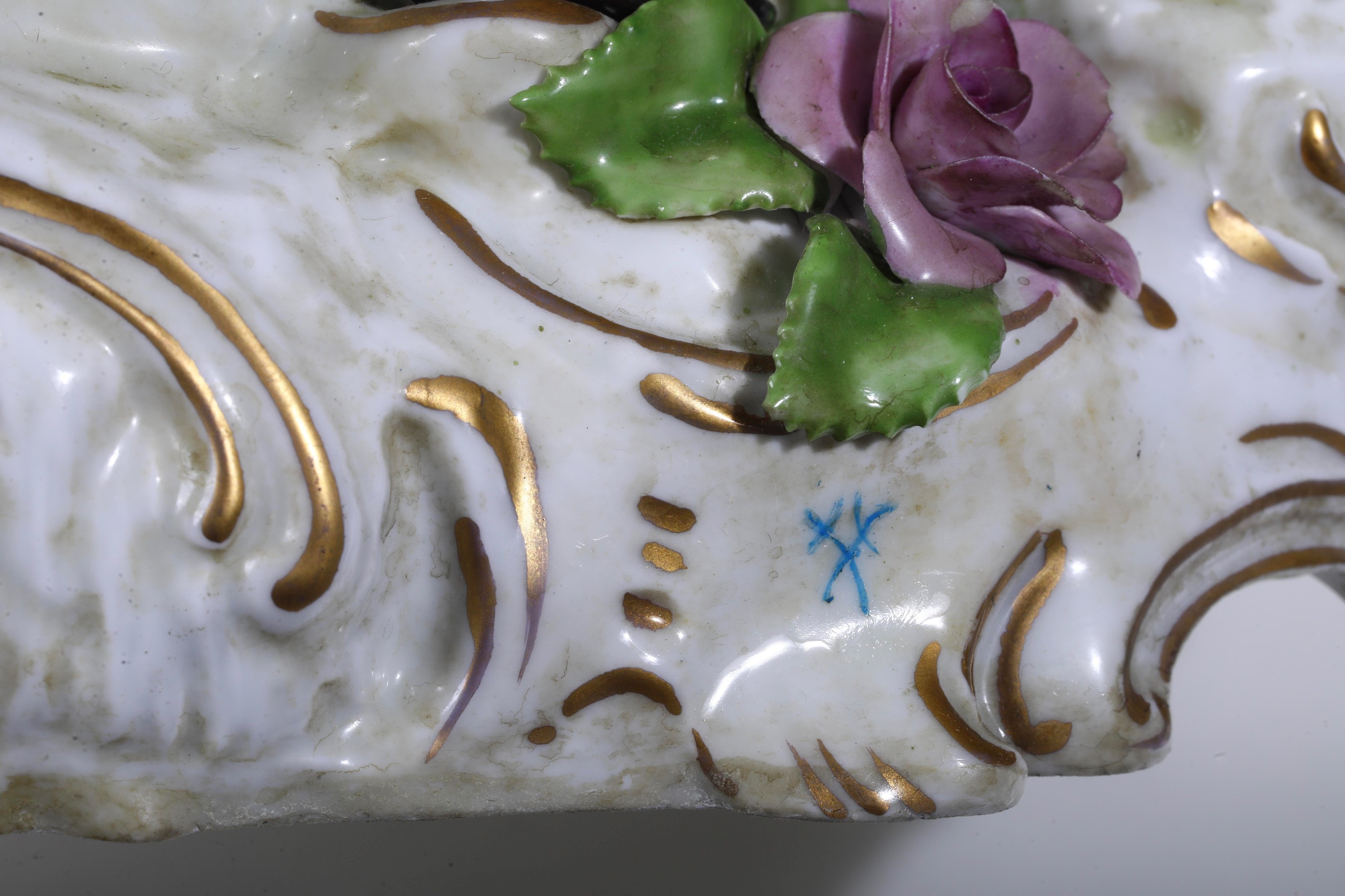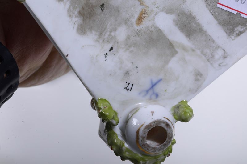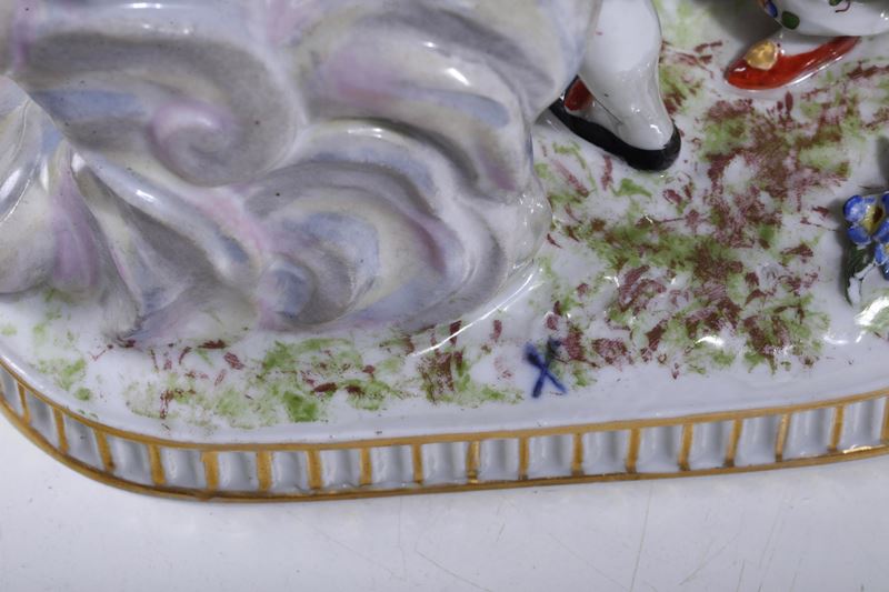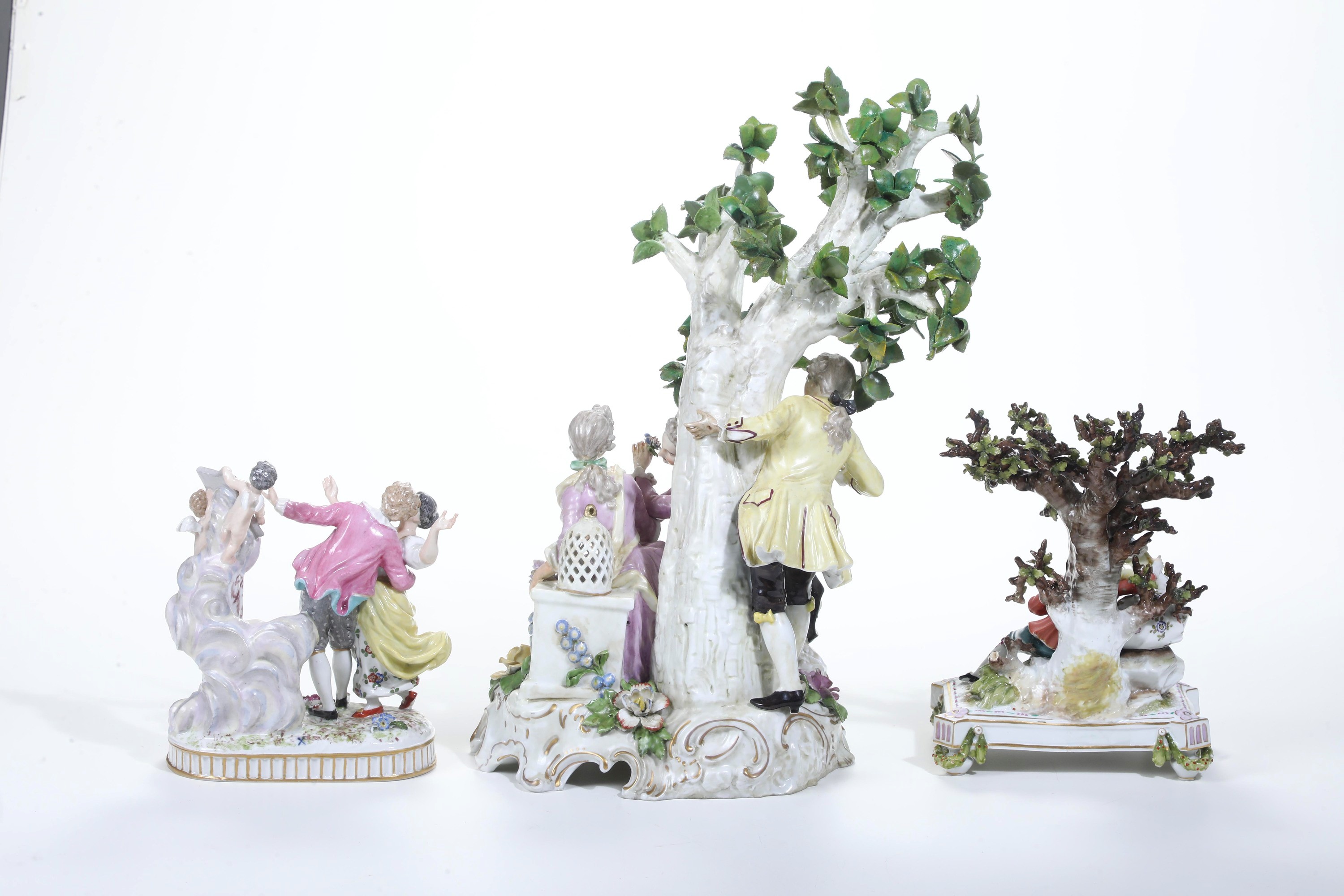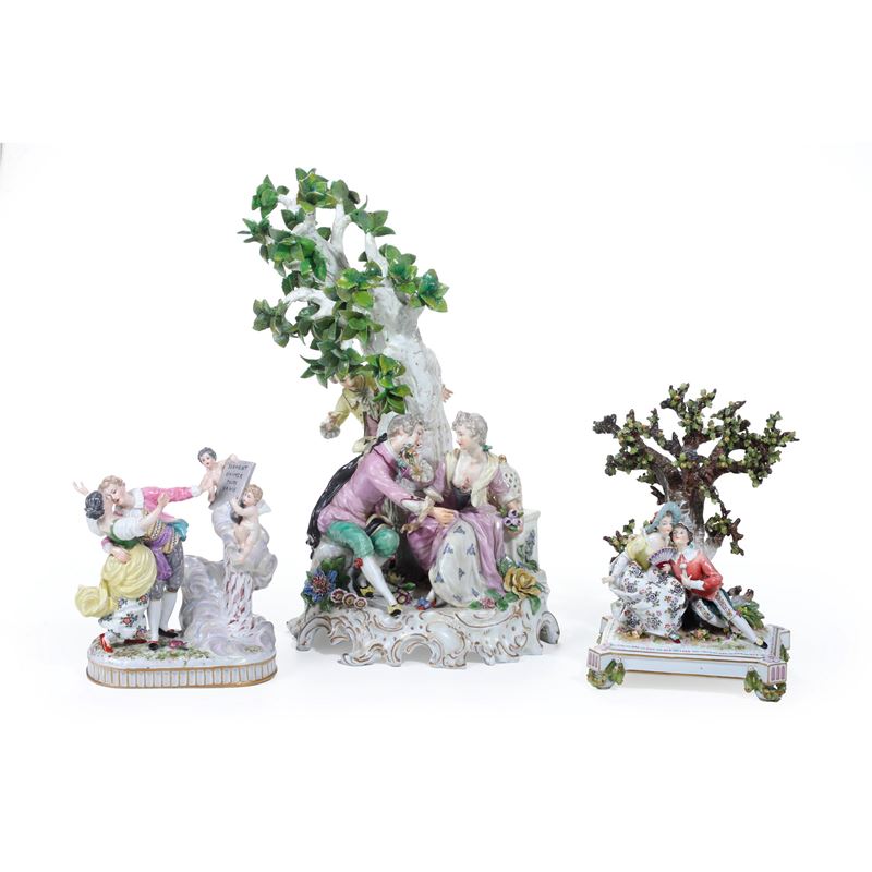 Porcellana. Marca: in blu per le manifatture di Parigi e manifatture della Turingia; sul gruppo grande, falsa di Meissen. Altezza massima cm 42. Conservazione: ottima per i due gruppi più piccoli; diversi restauri al gruppo di maggiori dimensioni