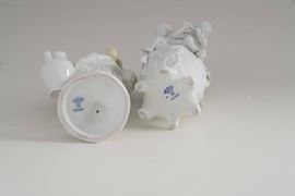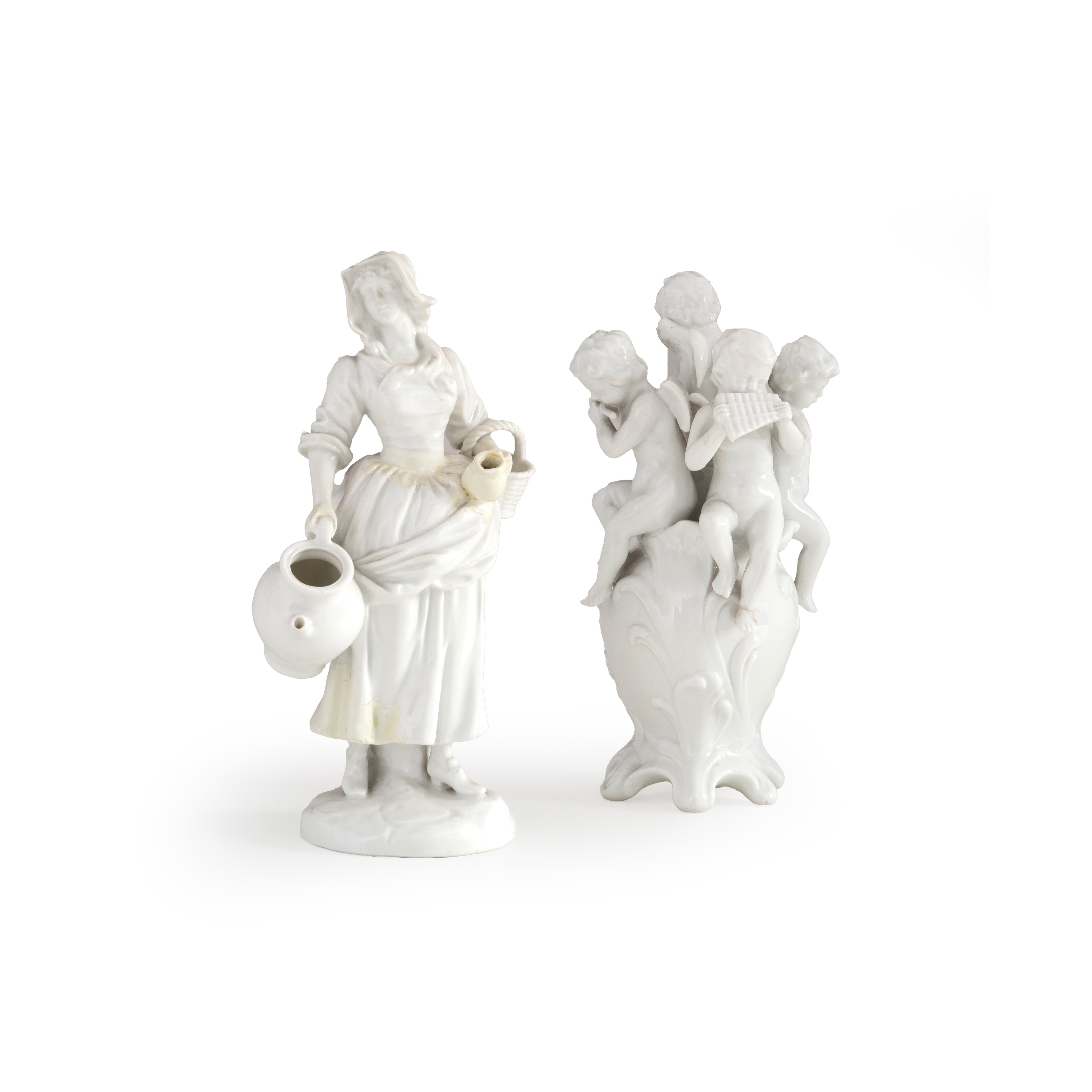 Porcellana. Marca: "N" con corona e "Ginori" in blu. Altezza massima cm 21,5. Conservazione: figura di popolana con estesi restauri alla gonna, alla brocca piccola, e alla vita; due putti con braccia mancanti.