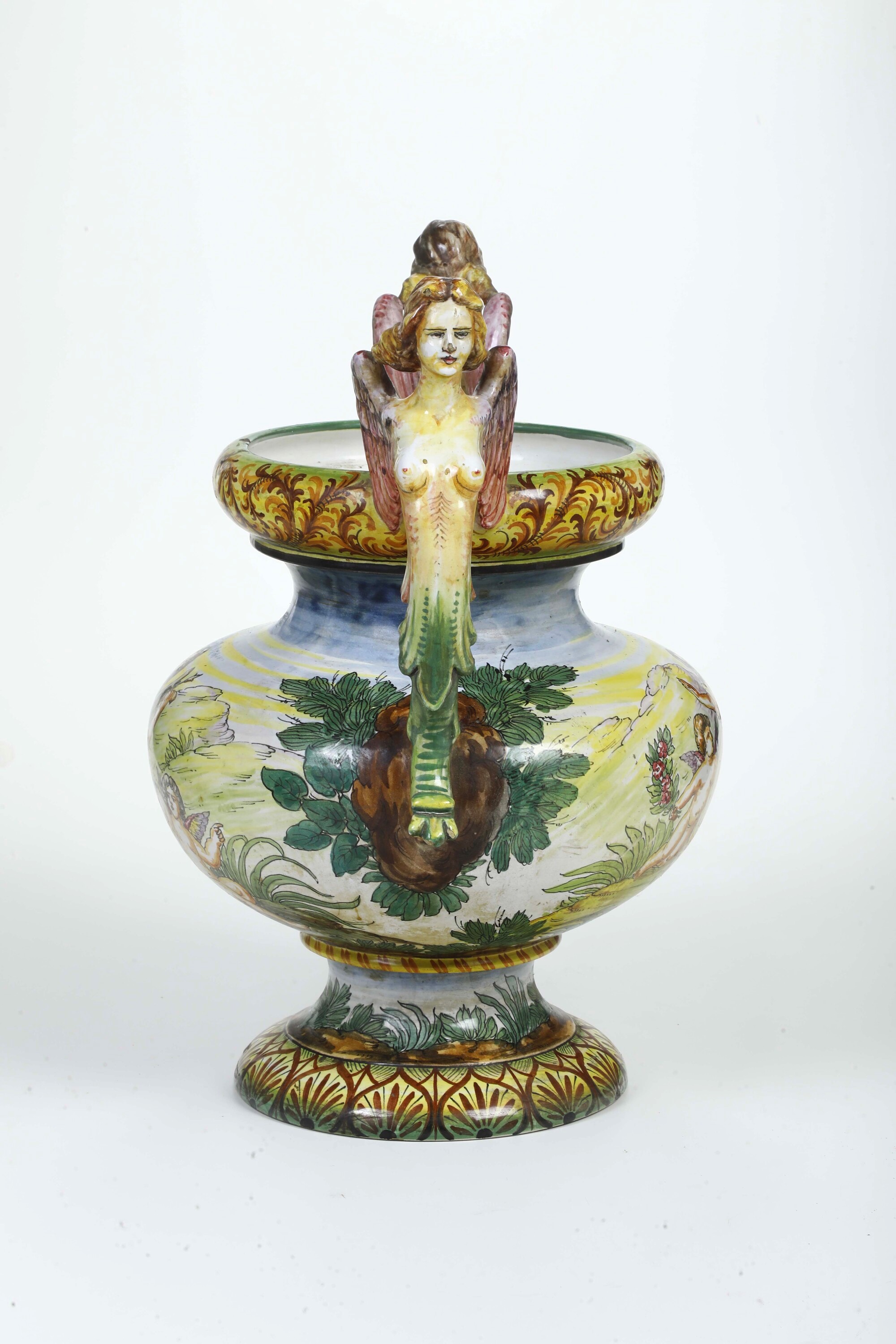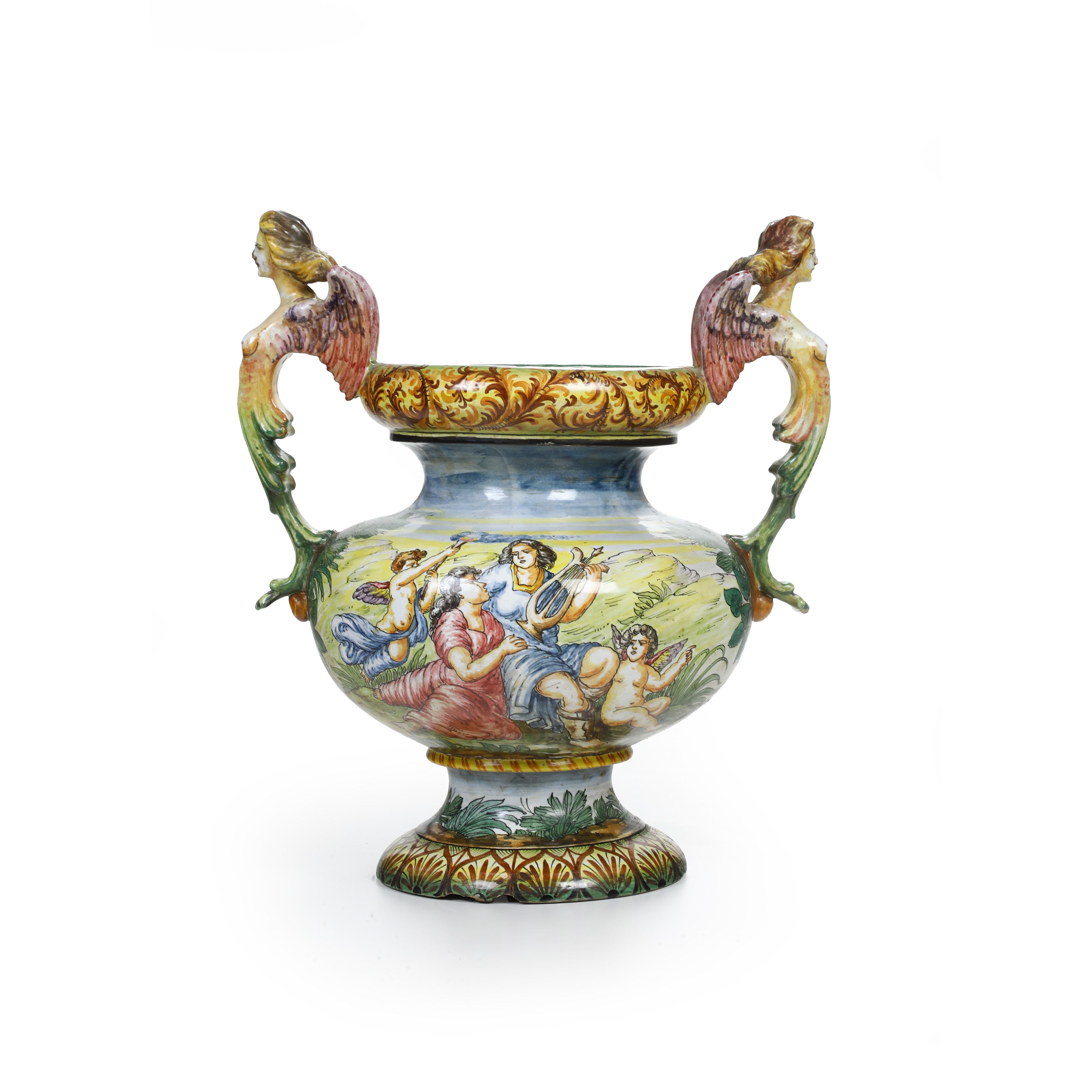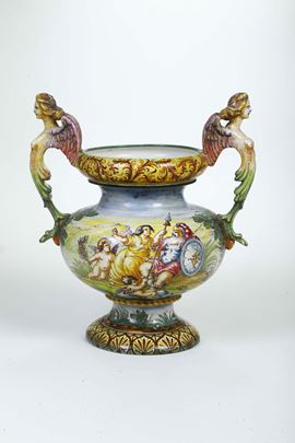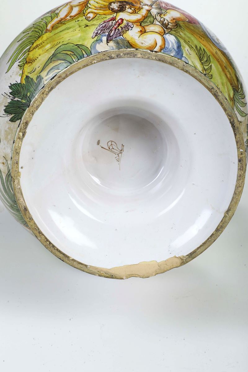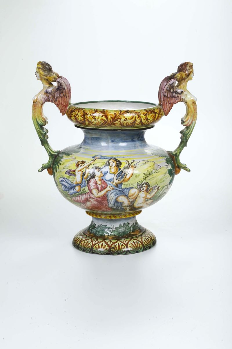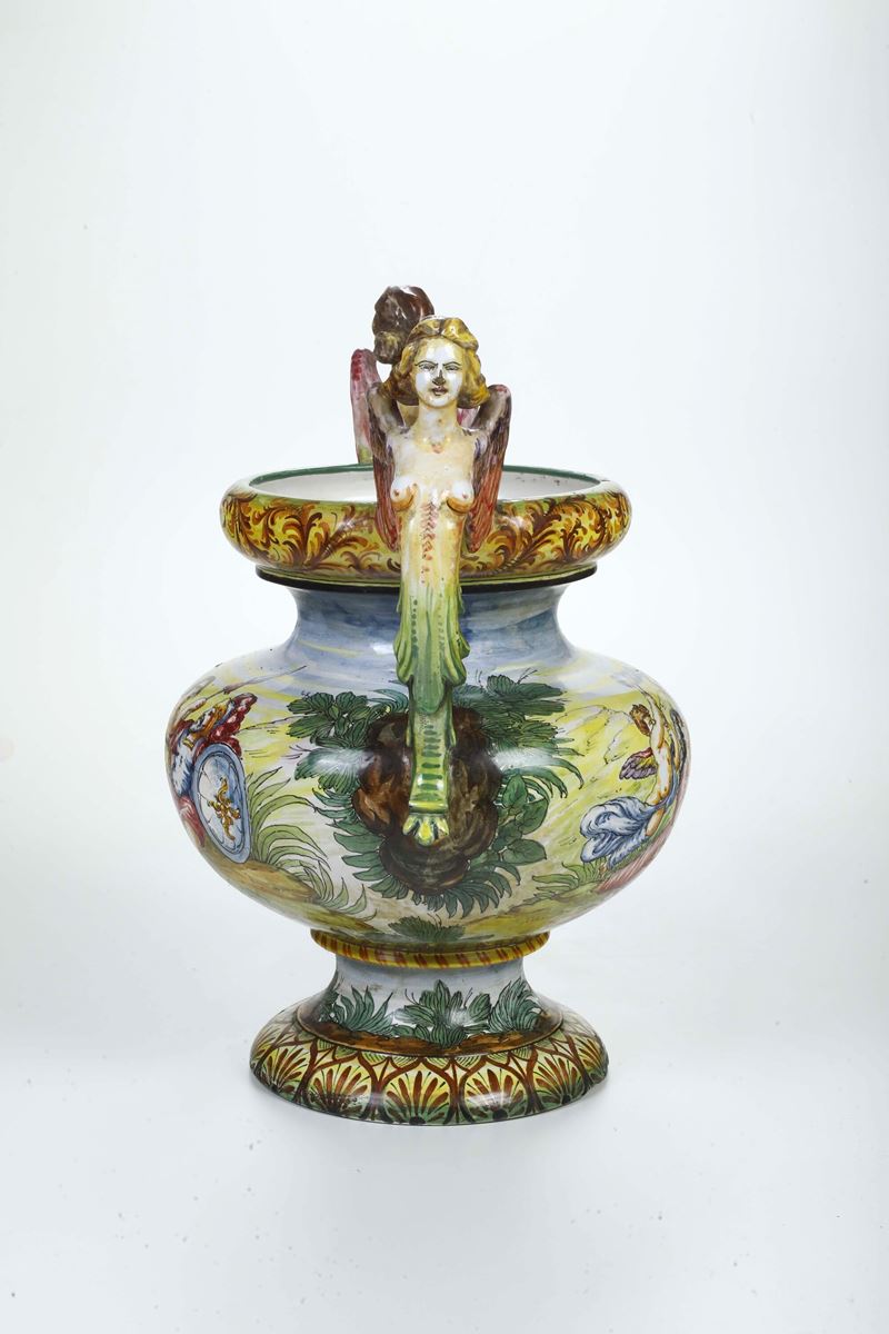 Maiolica policroma. Altezza cm 50. Conservazione: ottima; piccole cadute di smalto alle anse
