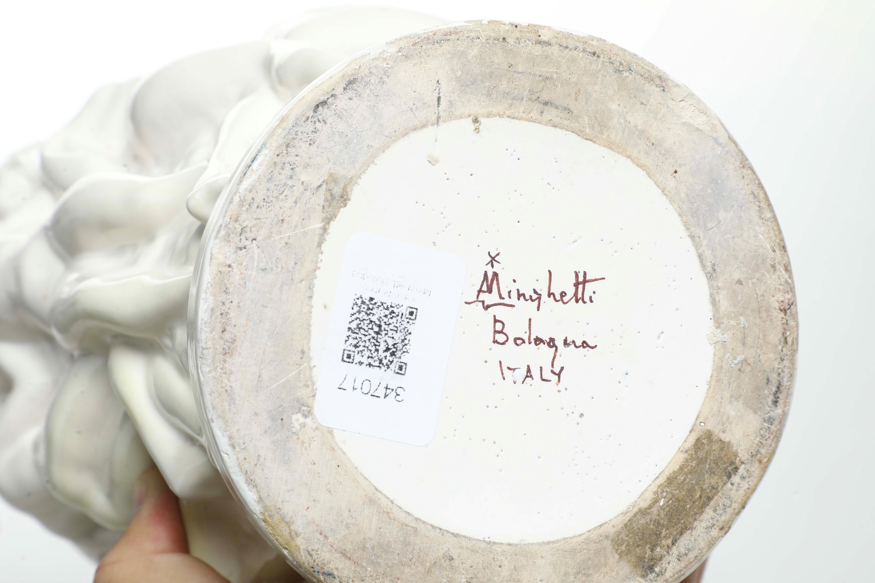 Maiolica. Marca: asterisco con "A. Minghetti Bologna Italy". Altezza cm 23. Conservazione: ottima.