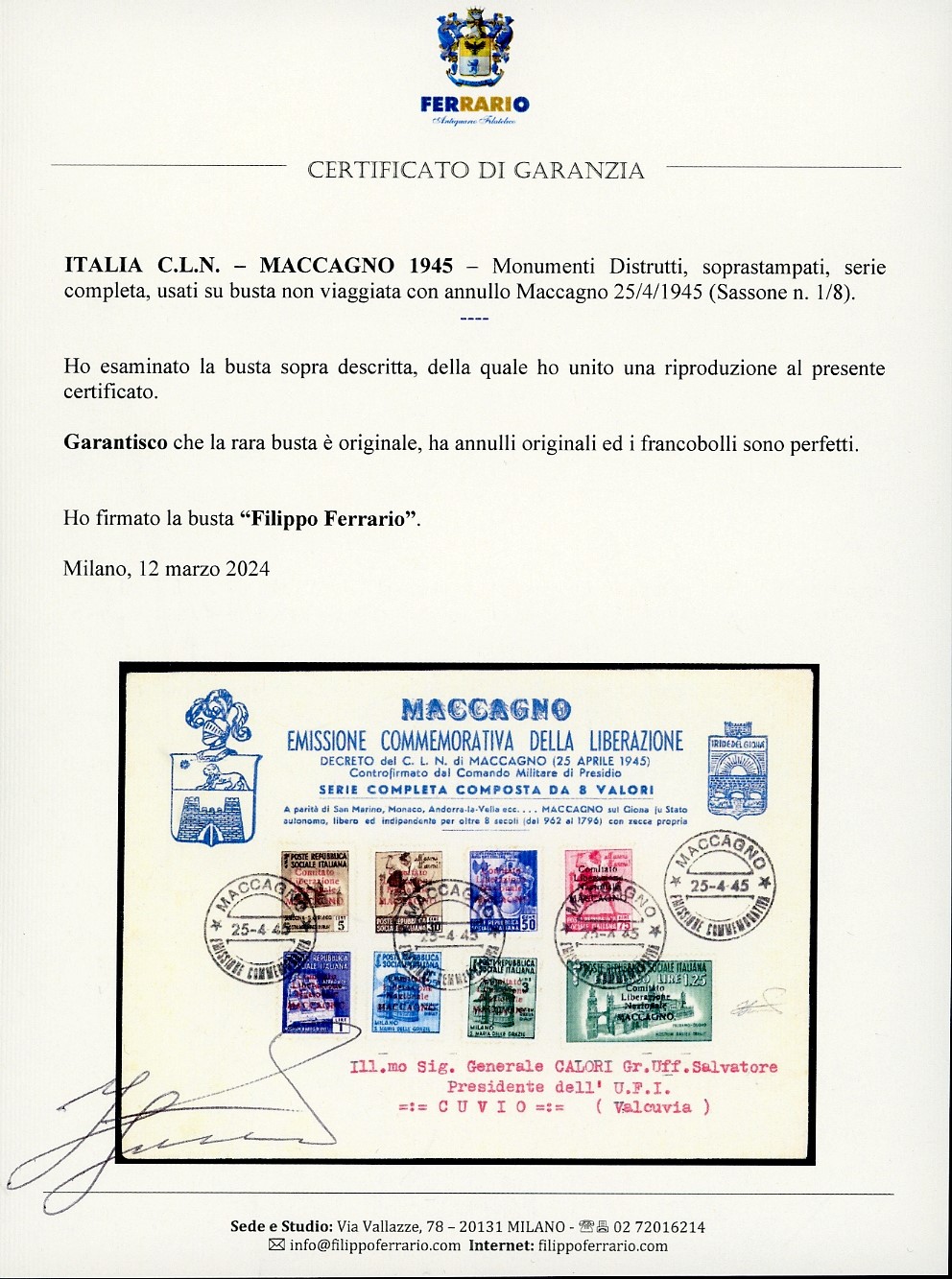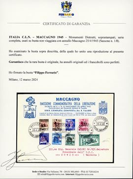 Perfetti, usati su busta non viaggiata con annullo Maccagno 25/4/1945. Rara. Cert. Ferrario. Cat. € 8.750