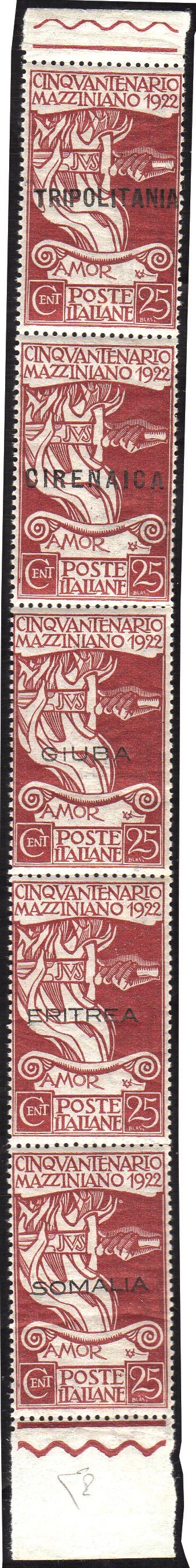 COLONIE ITALIANE - GIRI COLONIALI 1922 - 25 cent. bruno rosso, Mazzini (P1), striscia verticale di cinque esemplari