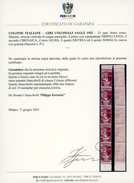 Il primo con soprastampa TRIPOLITANIA, il secondo CIRENAICA, il terzo GIUBA, il quarto ERITREA ed il quinto SOMALIA, gomma originale integra, perfetto. Si tratta dell'unico caso in cui in blocchi vi siano francobolli di cinque Colonie differenti. Questo francobollo soprastampato ebbe una tiratura di soli 10 esemplari per ciascuna colonia. Insieme unico e irripetibile! Cert. E.Diena e Ferrario.
