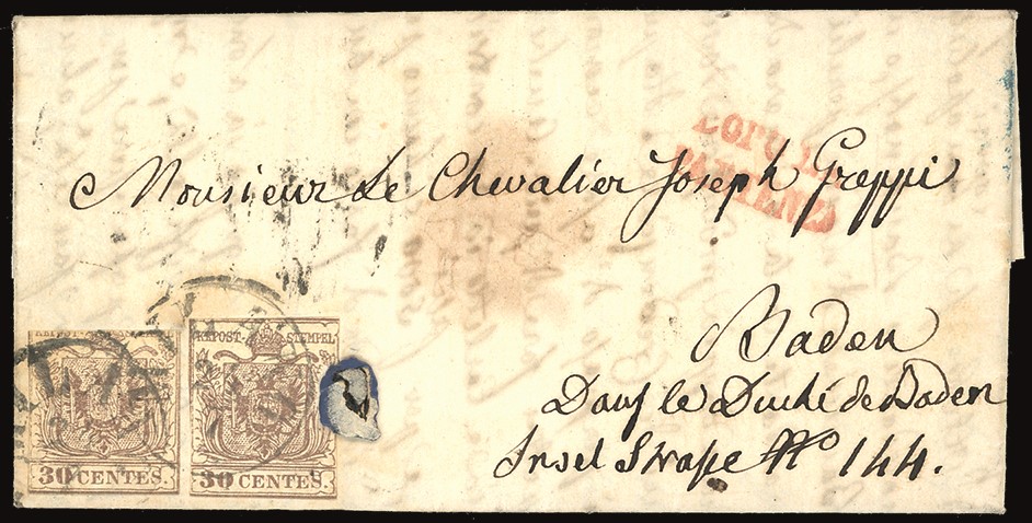 LOMBARDO VENETO 1858 - 30 cent. bruno, carta a macchina (21), due esemplari ritagliati lungo i margini "lilliput", su lettera da Milano 24/7/1858 a Baden, in Germania, sul fronte bollo rosso "dopo la partenza".