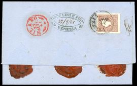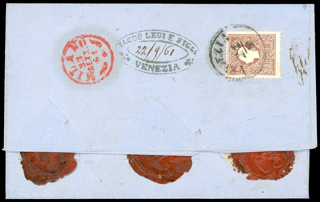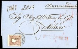 un esemplare sul fronte e uno al verso, per il diritto di raccomandazione, perfetti, su busta raccomandata da Venezia 21/9/1861 a Milano, tassata 60 cent.