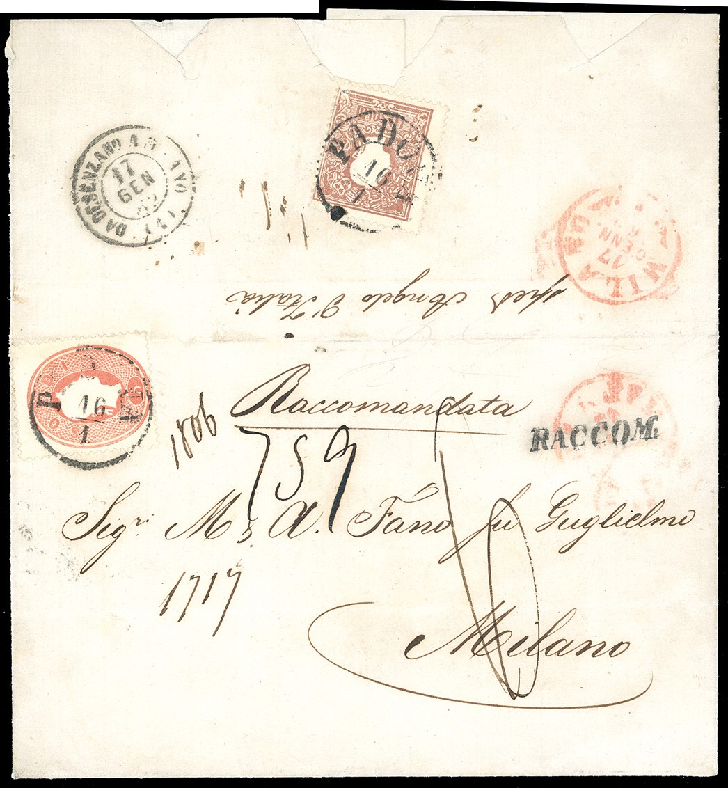 LOMBARDO VENETO 1862 - 5 soldi rosso e, al verso per il diritto di raccomandazione, 10 soldi bruno, II tipo (33,31), su fresca lettera raccomandata da Padova 16/1/1862 a Milano, tassata 60 cent.