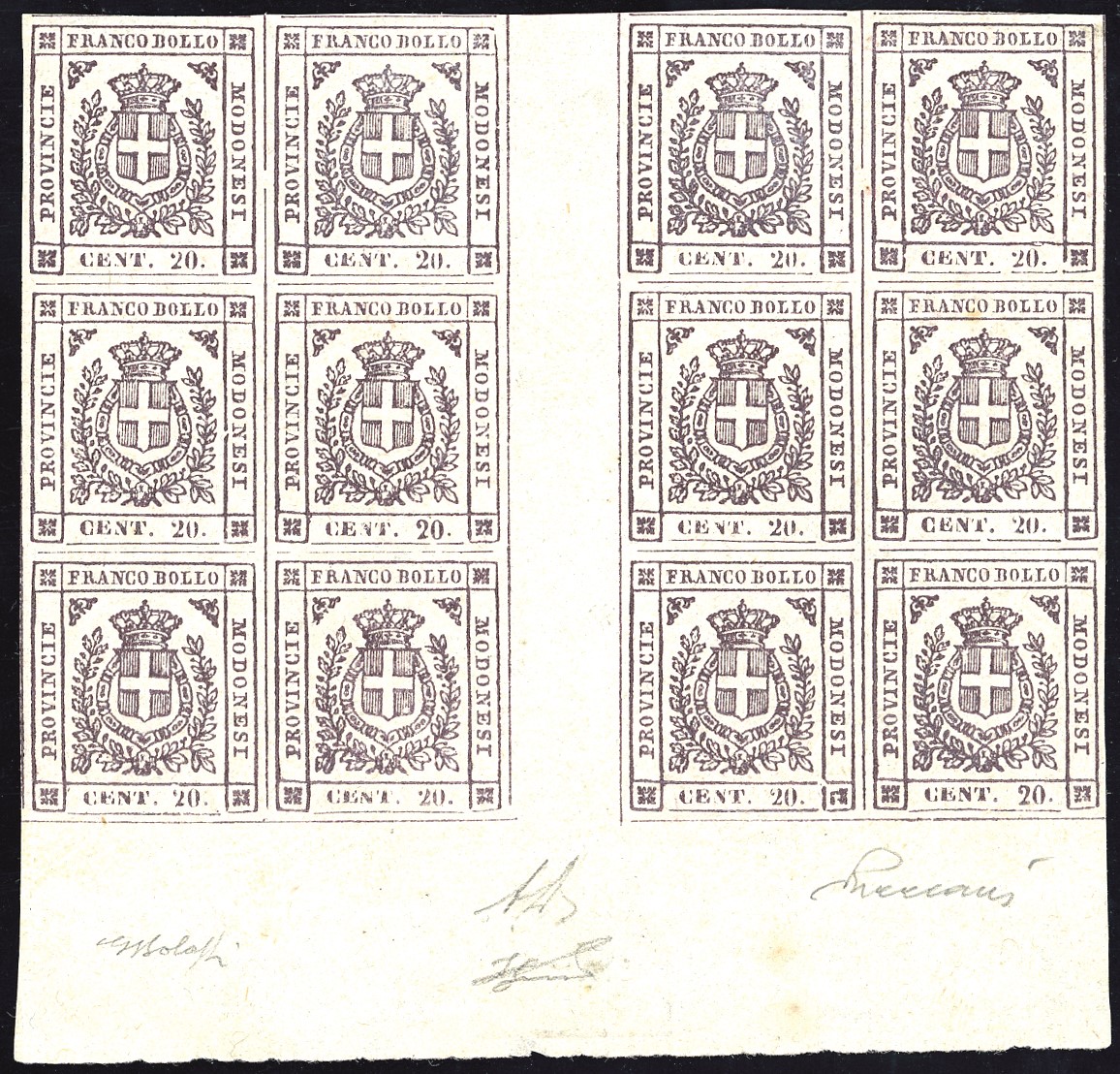 MODENA - GOVERNO PROVVISORIO 1859 - 20 cent. lilla grigio chiaro, blocco di dodici, bordo di foglio inferiore, contenente [..]