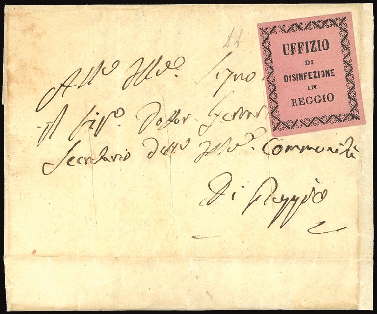 MODENA - SANITÀ 1855 - Lettera non affrancata da Modena (?) 17/7/1855 a Reggio, con tra tagli di disinfezione al centro e l'etichetta di sanità "Ufficio della disinfezione in Reggio" del II tipo secondo la catalogazione AISP. A.Diena.
