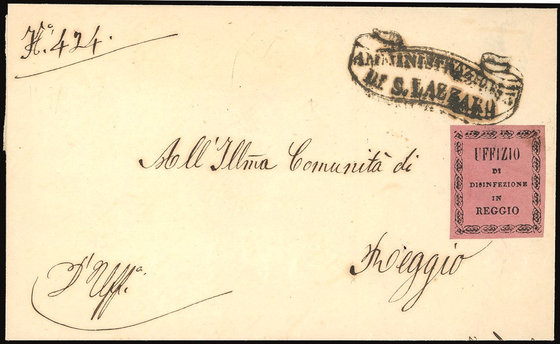 MODENA - SANITÀ 1855 - Lettera non affrancata da San Lazzaro 11/9/1855 a Reggio, dove venne applicata l'etichetta di sanità "Ufficio di disinfezione in Reggio" del III tipo seconda la catalogazione AISP.