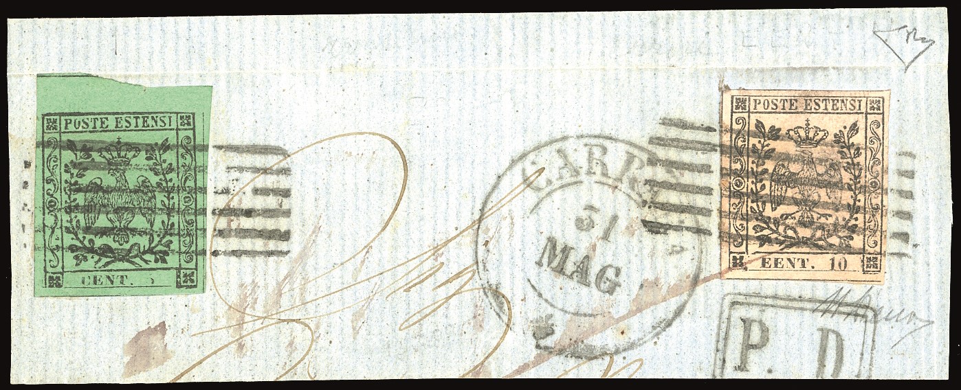 MODENA 1852 - 10 cent. rosa chiaro, errore tipografico "EENT.10", 5 cent. verde