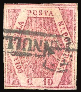 NAPOLI - FALSI PER POSTA 1859 - 10 grana carminio, falso per posta del II tipo (F4a)