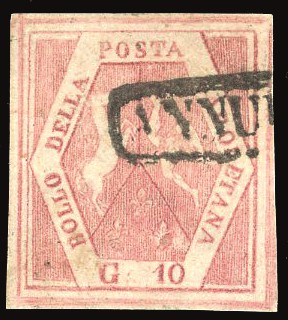 NAPOLI - FALSI PER POSTA 1860 - 10 grana rosa carminio, falso per posta del III tipo (F5)
