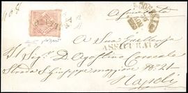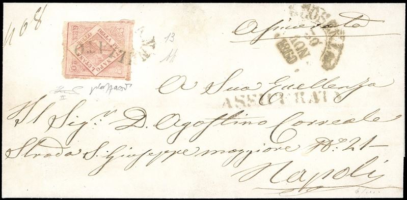 Separato a mano, perfetto, isolato su fresca lettera assicurata di cinque porti da Cosenza 30/11/1860, a Napoli. Raro uso isolato in periodo di Luogotenenza Farini. Molto bella e raro uso isolato per l'interno. A.Diena, Caffaz, Ferrario. Cat. €22.000++