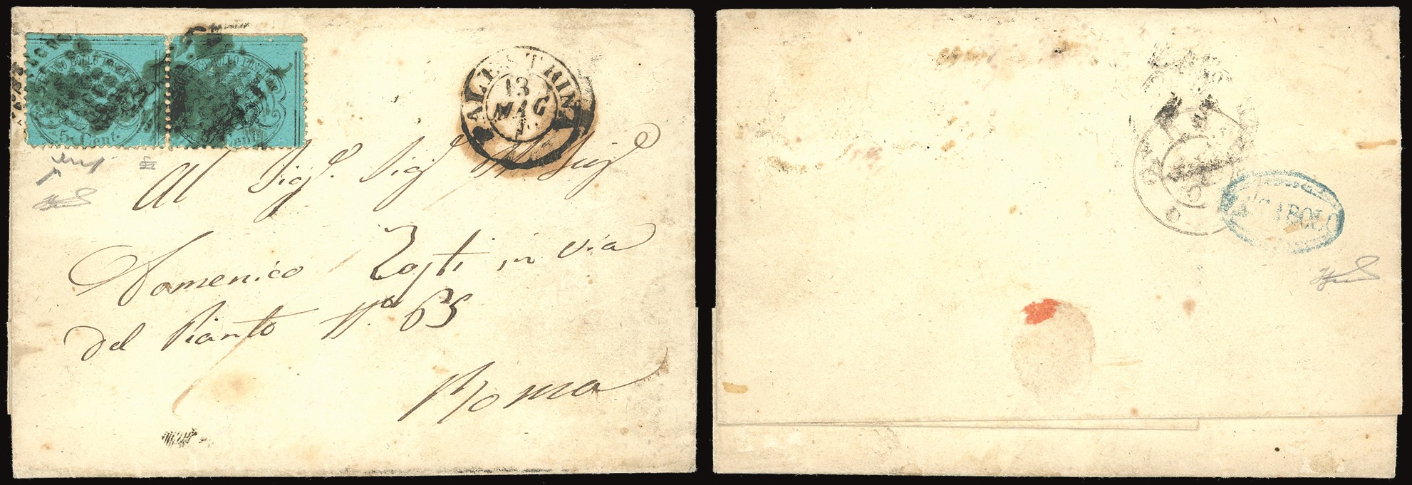 Coppia, perfetta, su lettera del 12/5/1870, transito di Palestrina sul fronte del giorno successivo, per Roma. Chiavarello, cert. Ferrario. Cat. € 9.000
