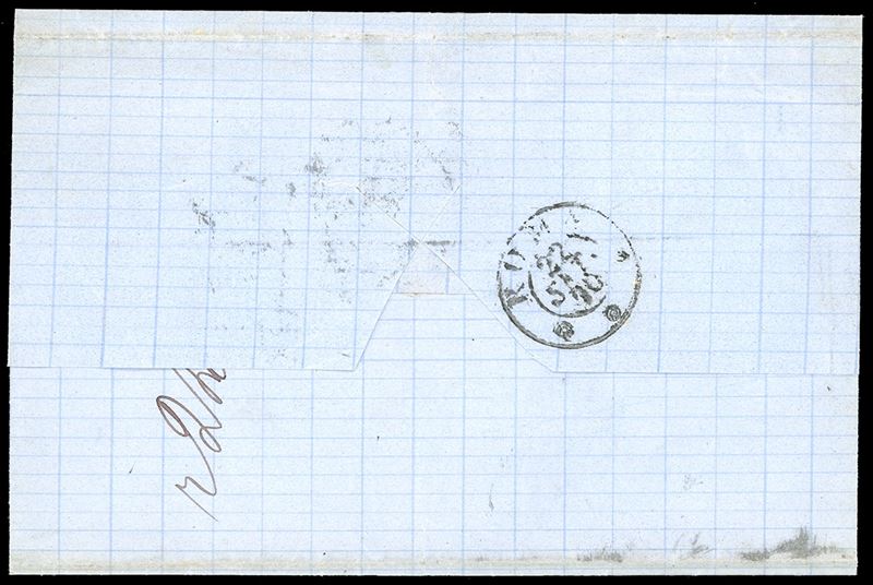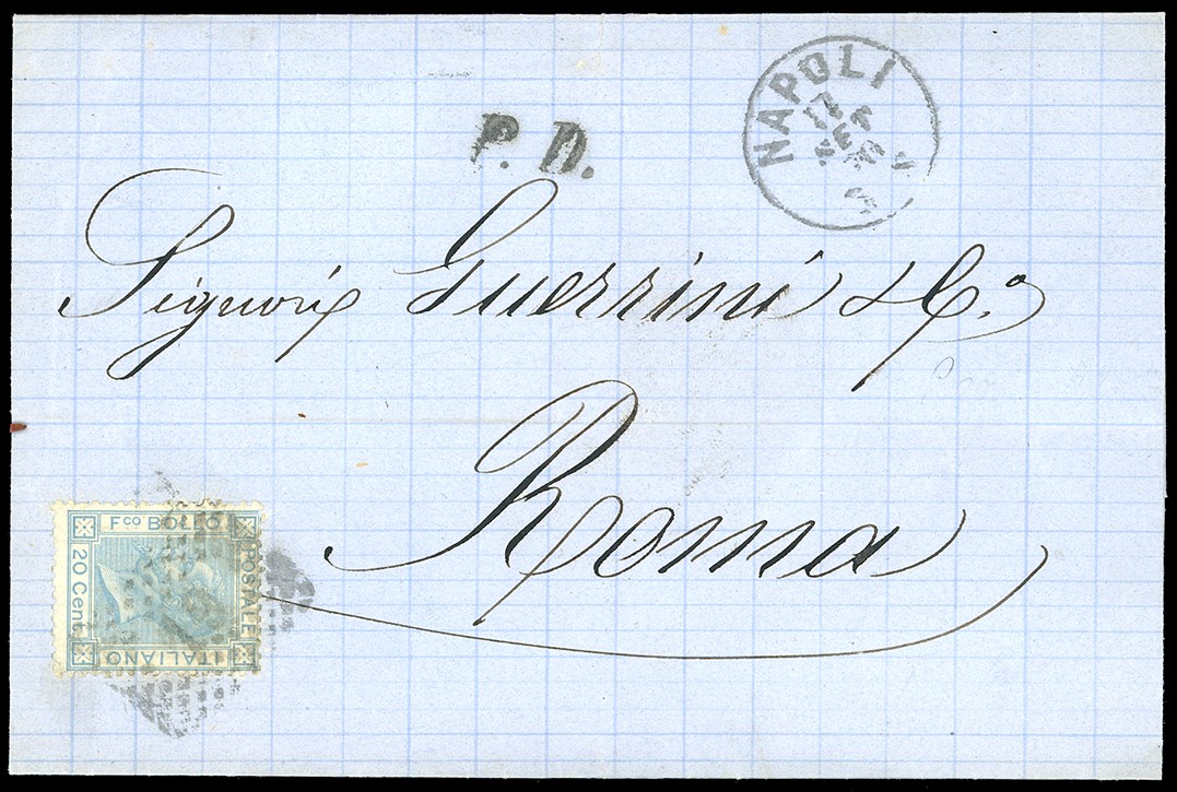 Tiratura di Torino (Regno T26), un angolo riparato, su fresca lettera da Napoli 17/9/1870 a Roma, dove giunse solo il 22 settembre 1870, come da annullo di arrivo al verso, a causa dell'assedio della città da parte dell'Esercito Italiano. Importante testimonianza storico postale della Presa di Roma.