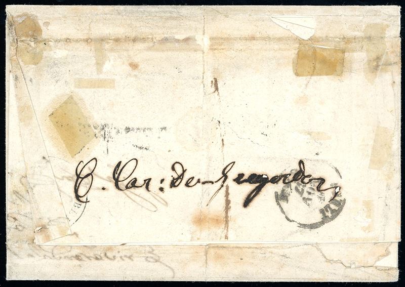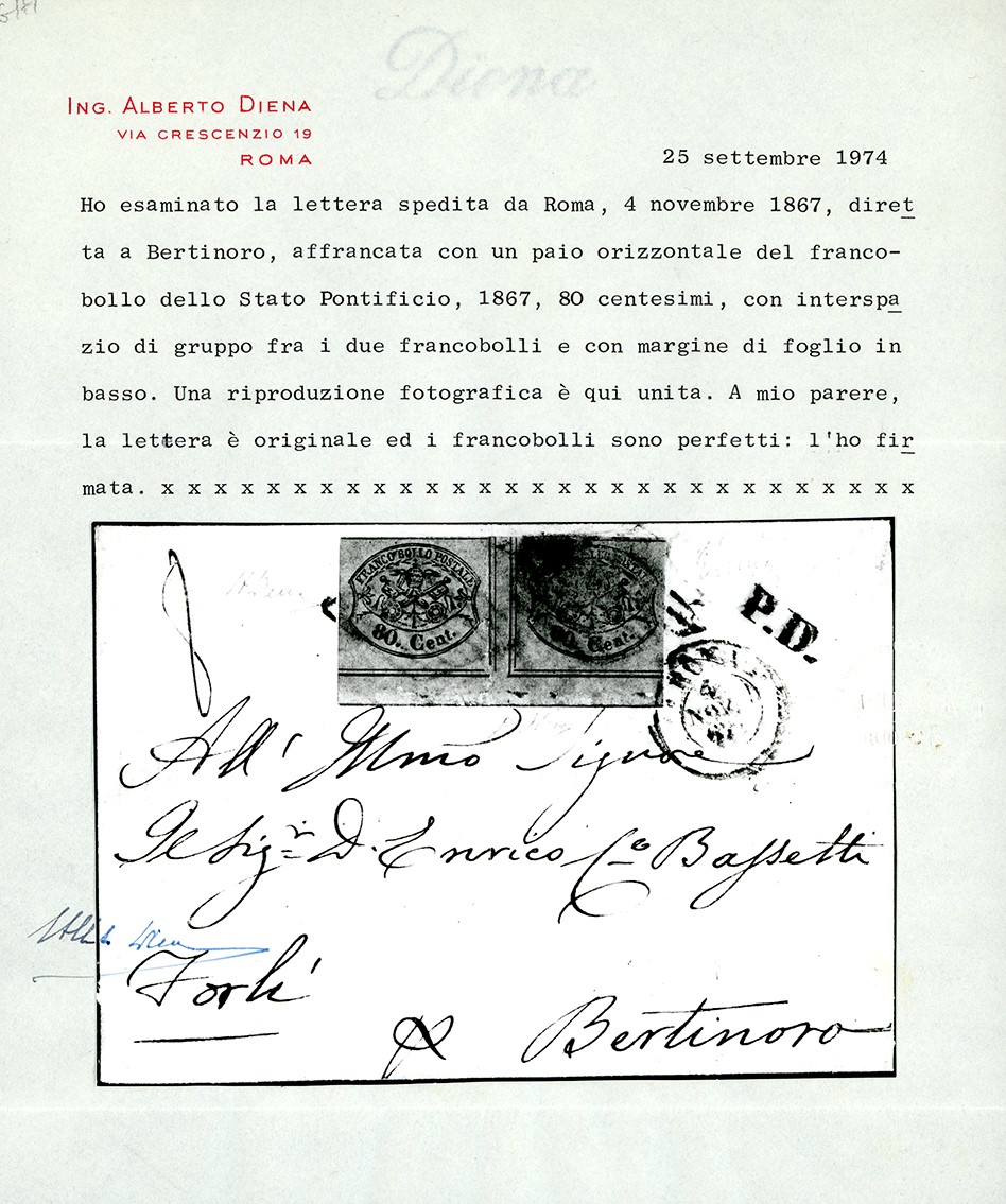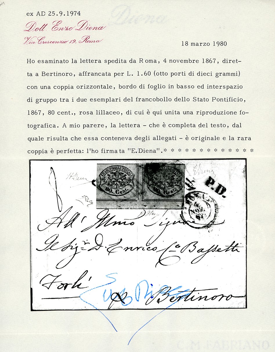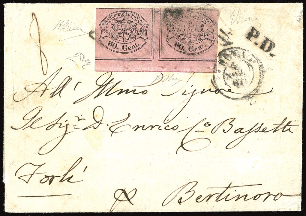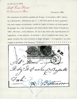 Coppia orizzontale con interspazio di gruppo al centro con bordo di foglio in basso, perfetta, su lettera di otto porti da Roma 4/11/1867 a Bertinoro. Rarissima e molto bella. Em.Diena, G.Oliva, cert. A. ed E.Diena. Cat. € 35.000+