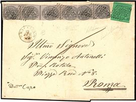 PONTIFICIO 1869 - 3 cent. grigio rosa, striscia orizzontale di quattro e coppia, 2 cent. verde (14,22), su sovracoperta di lettera da Bracciano 13/12/1869 a Roma