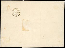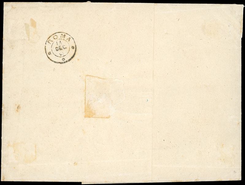 Malgrado i difetti, si tratta della massima affrancatura multipla nota di tutti i 3 centesimi dello Stato Ponificio. INSIEME UNICO DI ECCEZIONALE RARITA', da esposizione. Ancora non censita dai cataloghi. Emilio Diena per esteso, cert. Ferrario e Diena. Ex collezione Emilio Diena.