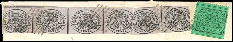 PONTIFICIO 1869 - 3 cent. grigio rosa, striscia orizzontale di quattro e coppia, 2 cent. verde (14,22), su sovracoperta [..]