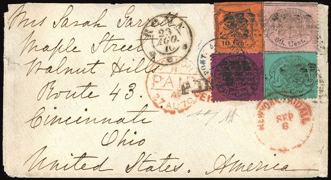 Ottimo stato, su busta da Roma 23/8/1870 per gli Stati Uniti d'America. Pregevole affrancatura quadricolore della terza emissione. A.Bolaffi, A.Diena.