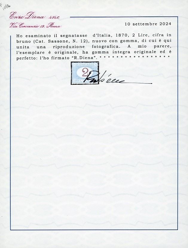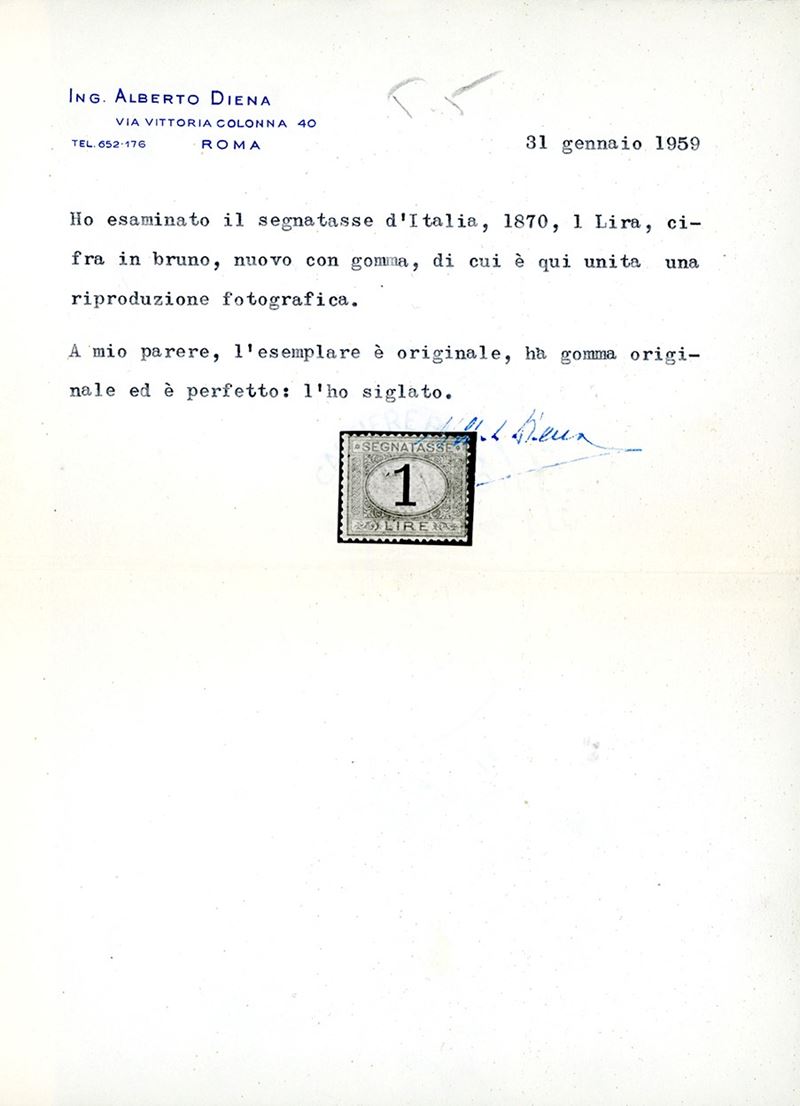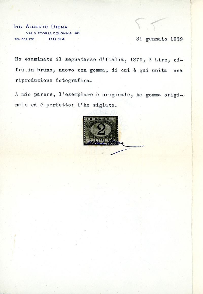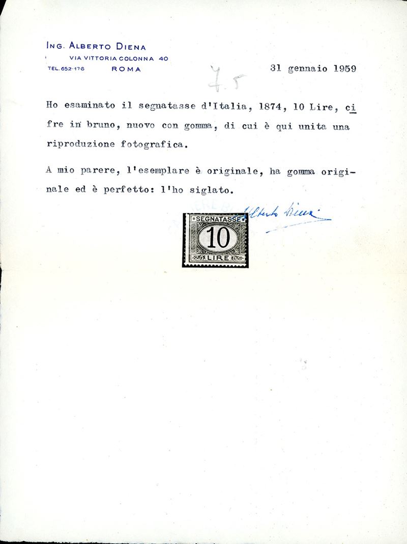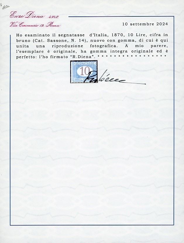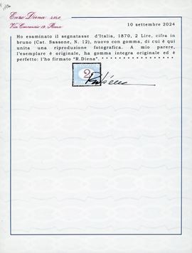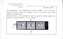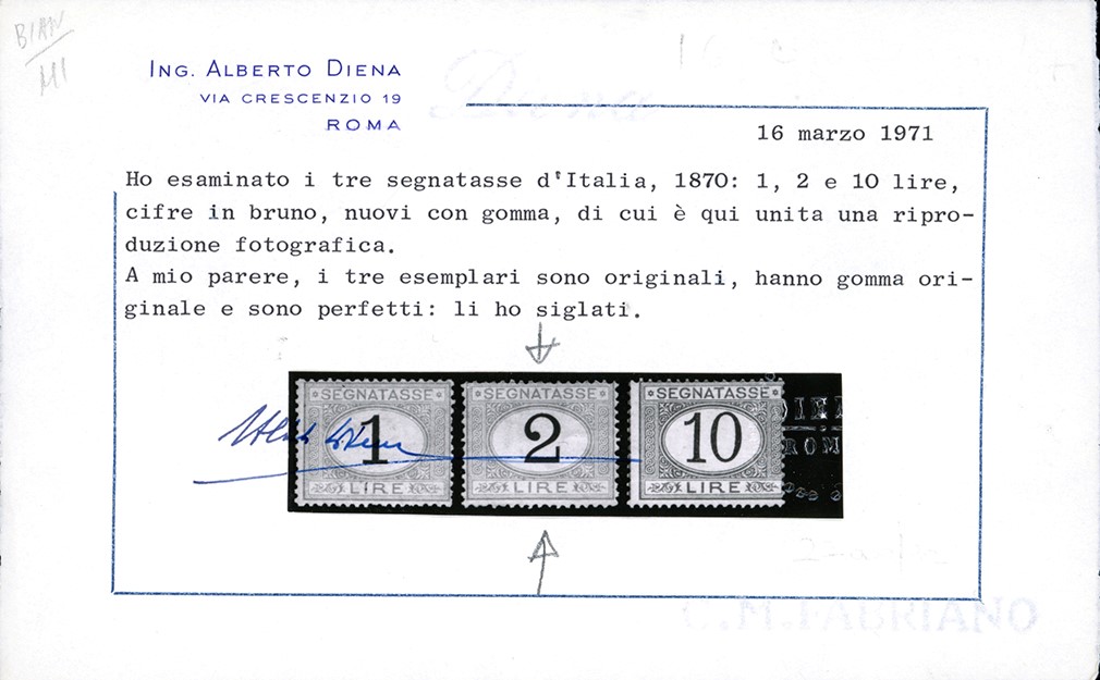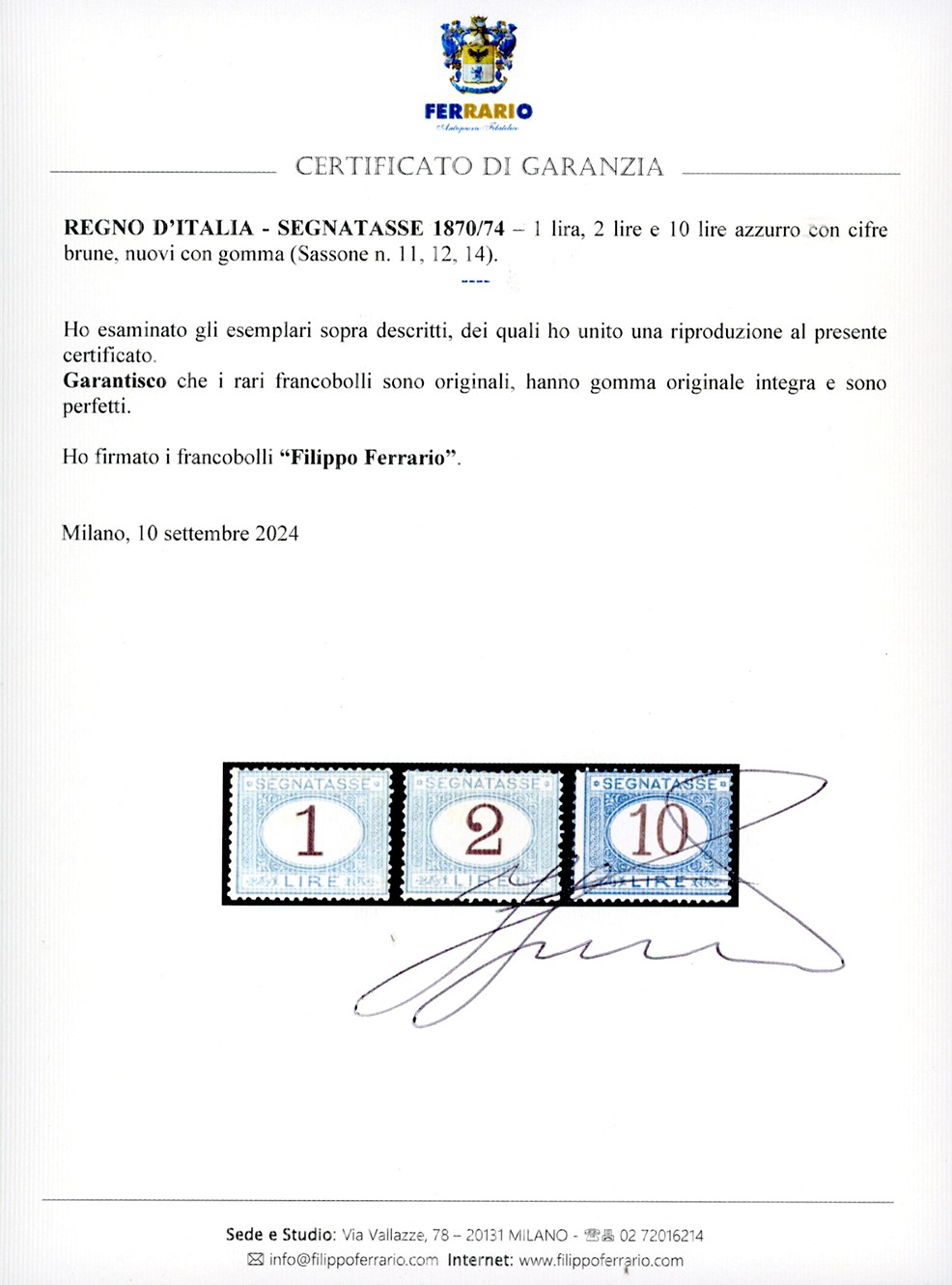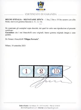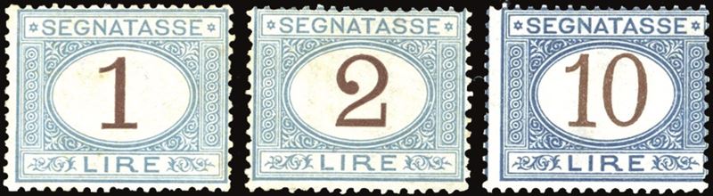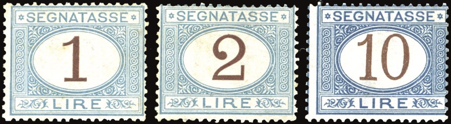 REGNO D'ITALIA - SEGNATASSE 1870/74 - 1 lira, 2 lire, e 10 lire azzurro cifre brune (11,12,14)