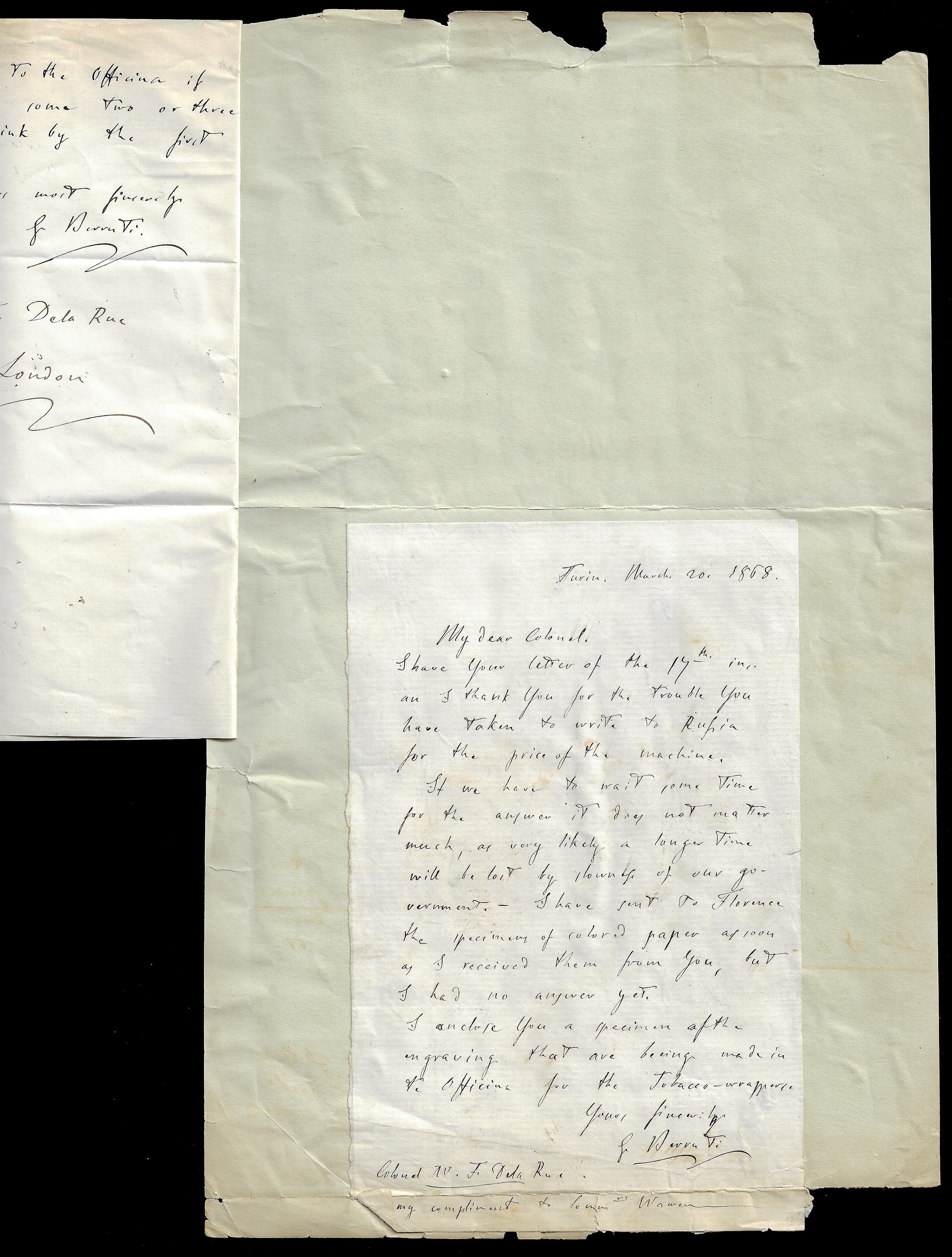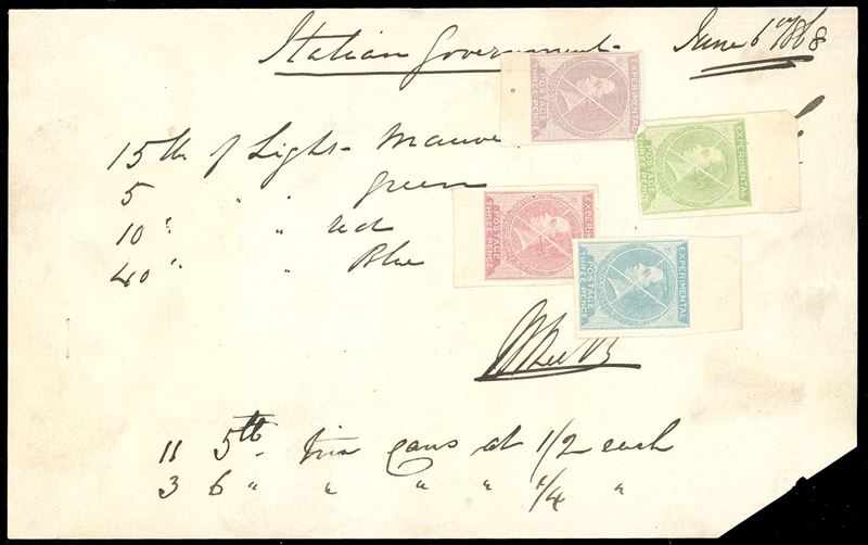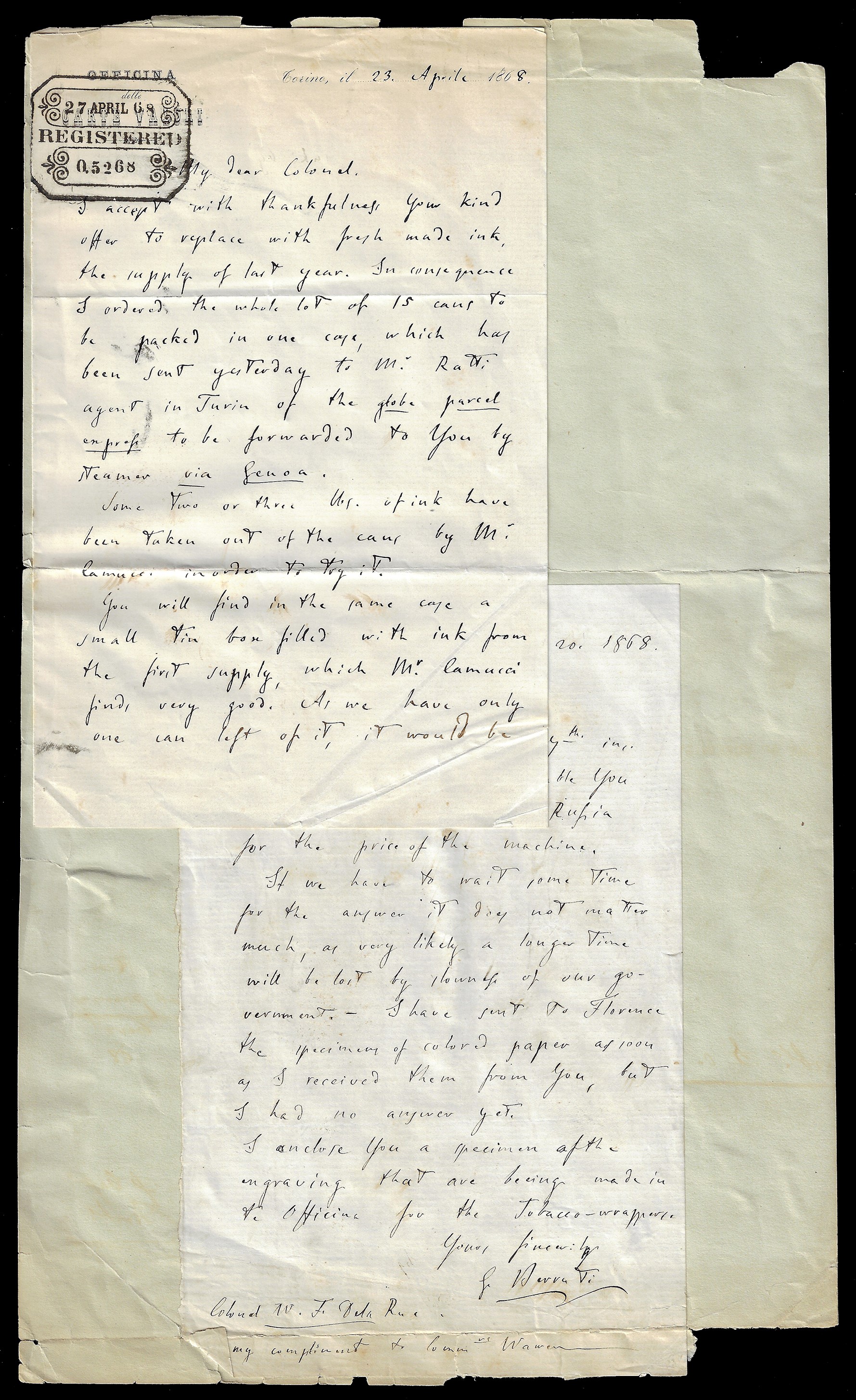 In particolare è presente un prezzario delle forniture, con allegati sei saggi di colori per la scelta delle provviste, a cui è stata unita una lettera datata Torino29/4/1868 con un ulteriore saggio e due ulteriori corrispondenze del marzo/aprile 1868, nonché due ulteriori schede intestate "Italian inks" e "Italian Government", anch'esse con saggi di colore. Insieme unico, per specialista. Da esposizione.