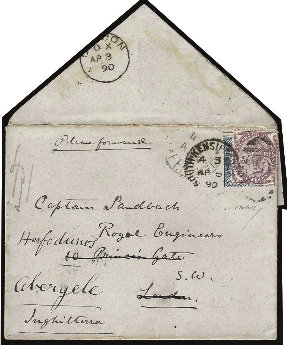 Su busta da Firenze 4/4/1890 a Londra, rispedita a Abergela previa riaffrancatura con 1 p. Regina Vittoria, II tipo (73). Bella mista di rispedizione! A. Bolaffi.