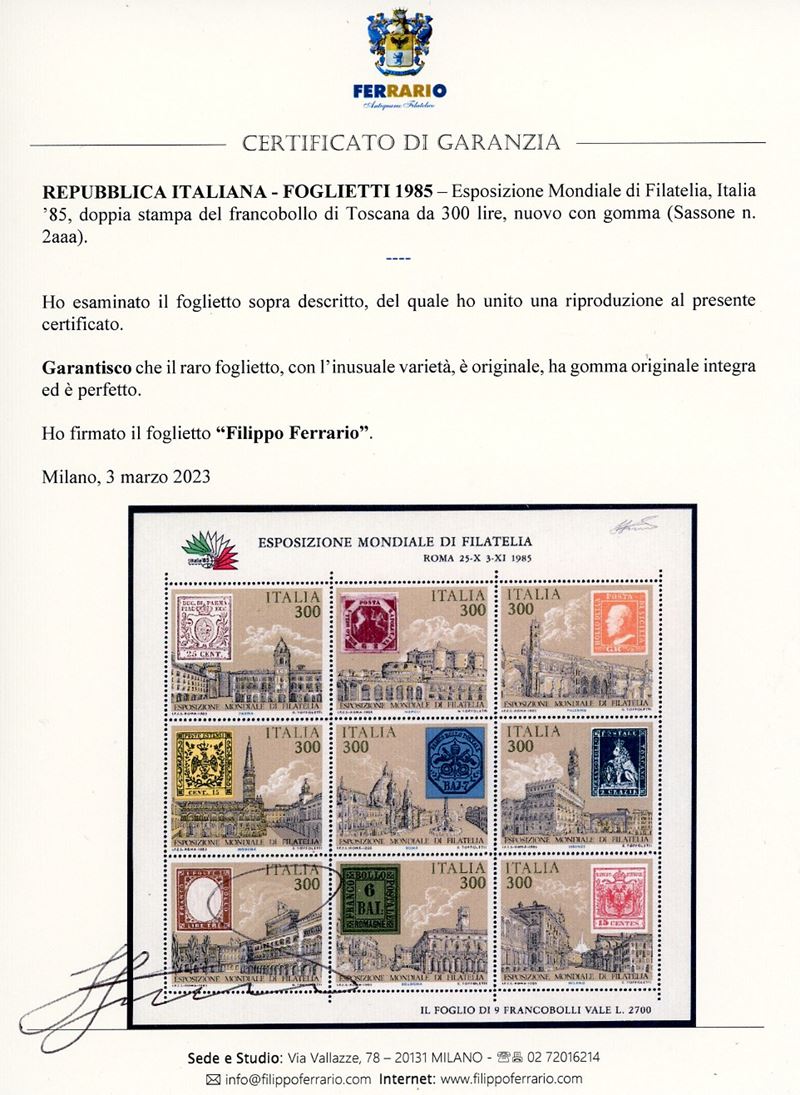 REPUBBLICA ITALIANA - FOGLIETTI 1985 - 300 lire Italia '85, foglietto, doppia stampa del francobollo di Toscana (2aaa)