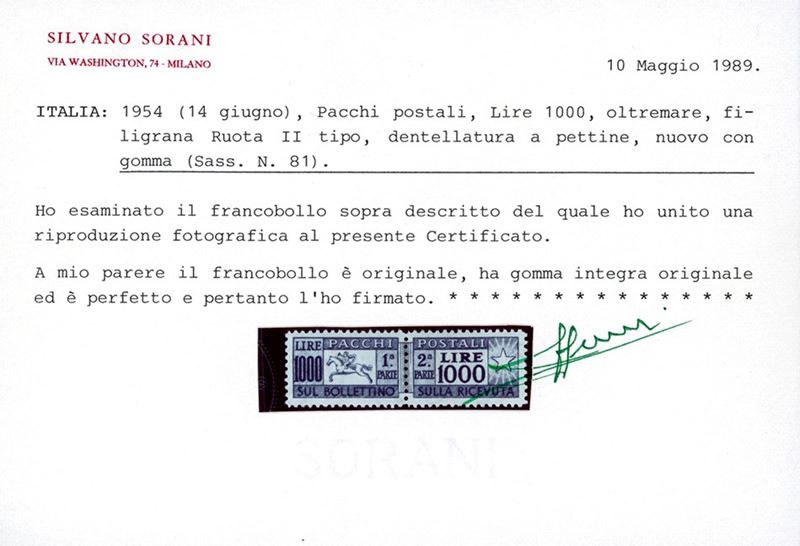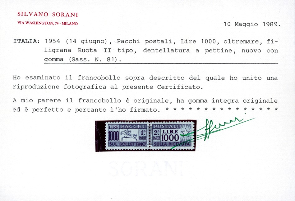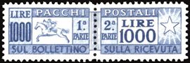 REPUBBLICA ITALIANA - PACCHI POSTALI 1954 - 1.000 lire Cavallino, filigrana ruota (81)