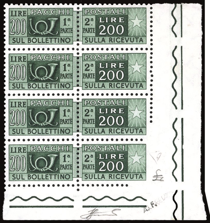 REPUBBLICA ITALIANA - PACCHI POSTALI 1955 - 200 lire, filigrana stelle del II tipo, striscia verticale di quattro, l'ultimo [..]