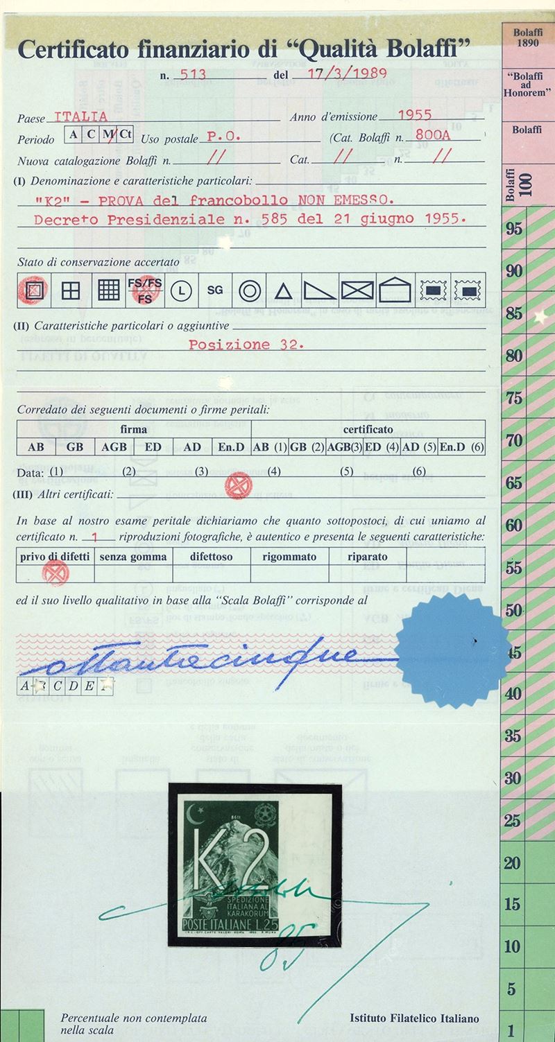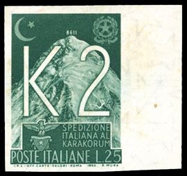 REPUBBLICA ITALIANA 1955 - 25 lire K2, prova su carta con filigrana del francobollo non emesso, francobollo naturale (Sassone P1, Bolaffi 873 punti 425)