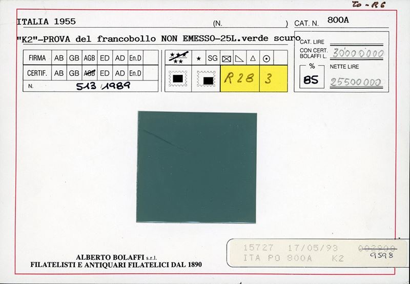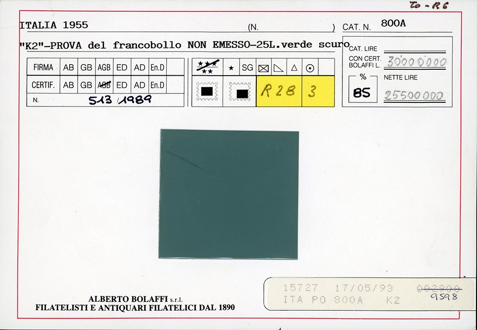 REPUBBLICA ITALIANA 1955 - 25 lire K2, prova su carta con filigrana del francobollo non emesso, francobollo naturale (Sassone [..]