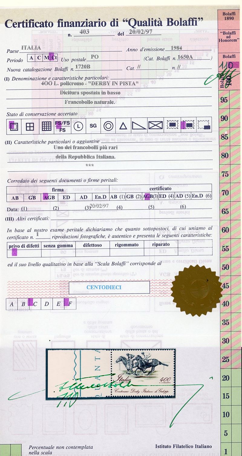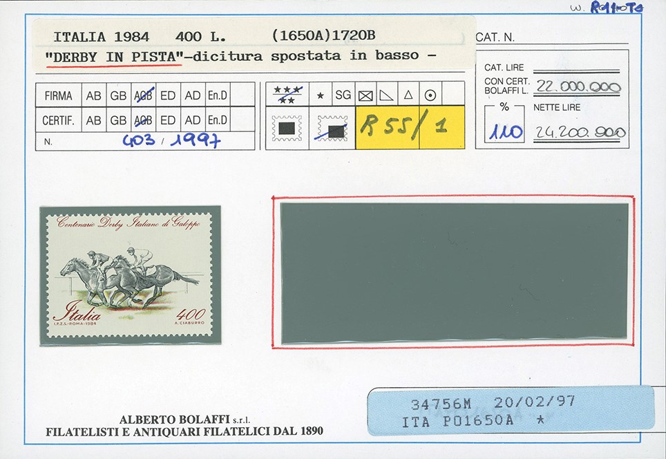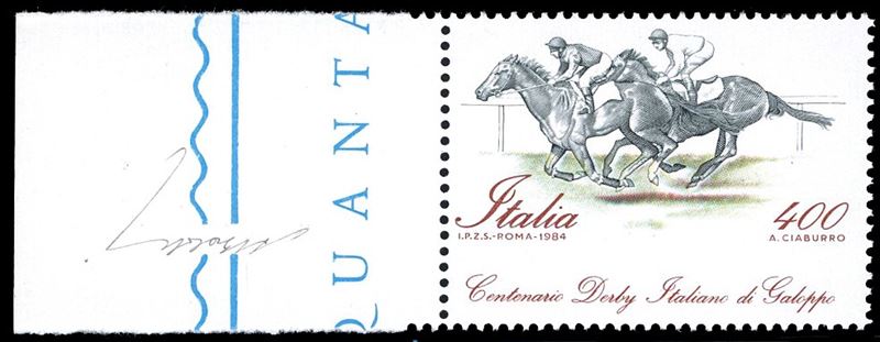 Dentellatura orizzontale fortemente spostata in basso, francobollo naturale (Sassone 1684a,Bolaffi 1794B punti 240), bordo di foglio, nuovo, gomma originale integra, perfetto. Raro e di ottima qualità. Cert. Finanziario Bolaffi 110%. Cat. € 11.000+