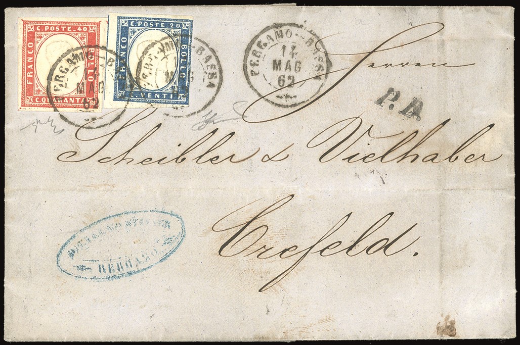 Su lettera da Bergamo Bassa 14/5/1862 a Crefeld, in Germania, viaggiata per la "VIA DI SVIZZERA", bolli di transito e arrivo al verso, tra cui il lacuale "Lario (1)". Bella e non comune. Ferrario, Chiavarello.
